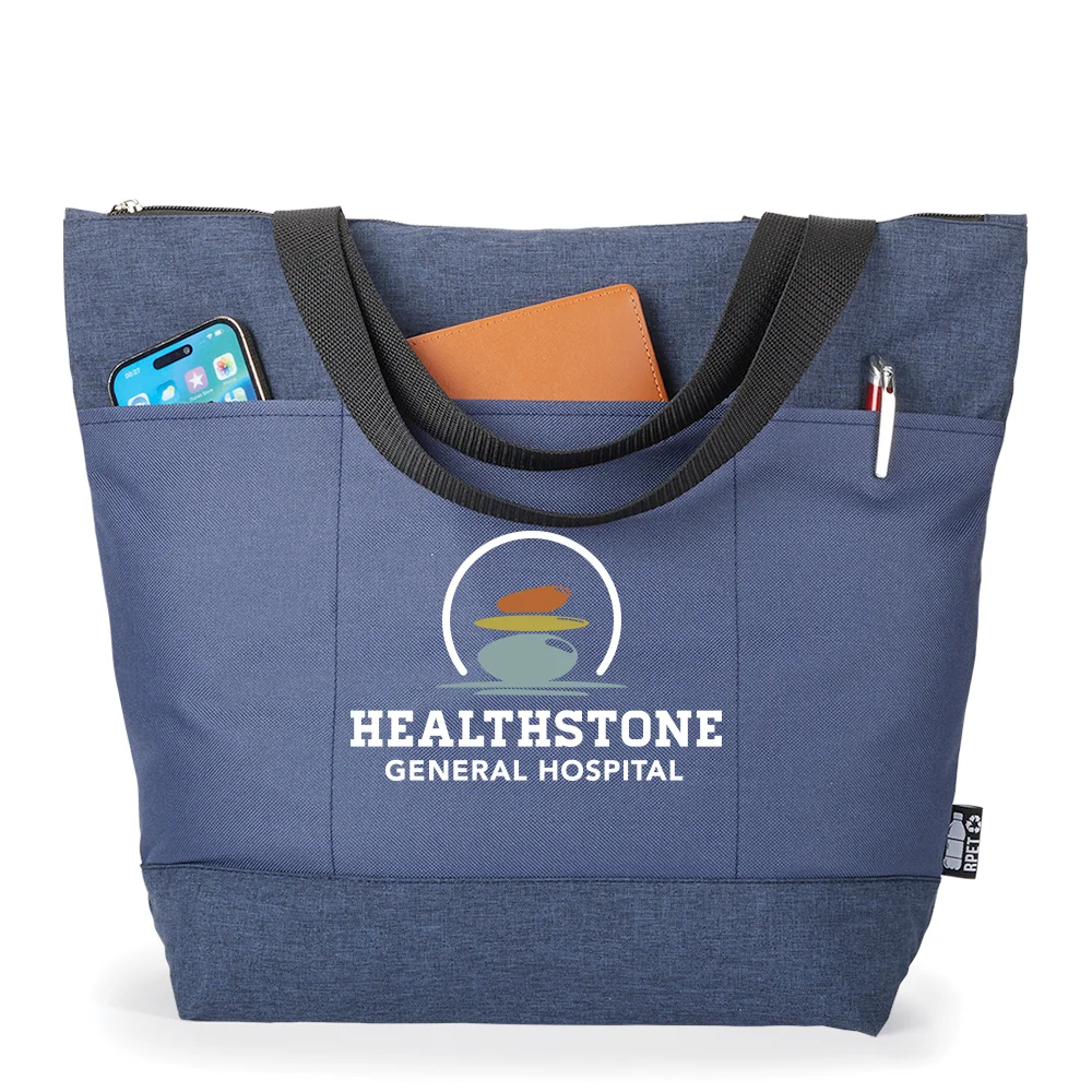 Personalized Computer/Laptop Tote: Large main compartment with zip closure; Padded tech sleeve protects most laptops up to 17"; Interior slip pocket for phone, ID, or small accessories; 3 exterior pockets for accessible organization; Comfortable carry: slip dual straps over shoulder or hold in hand; Trolley strap slides over luggage handles for travel ease; Durable, water-resistant exterior made of 300-denier/600-denier polyester rPET
