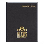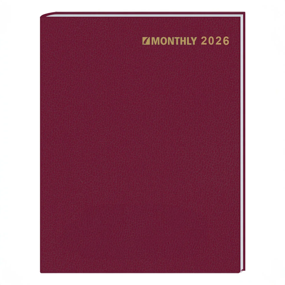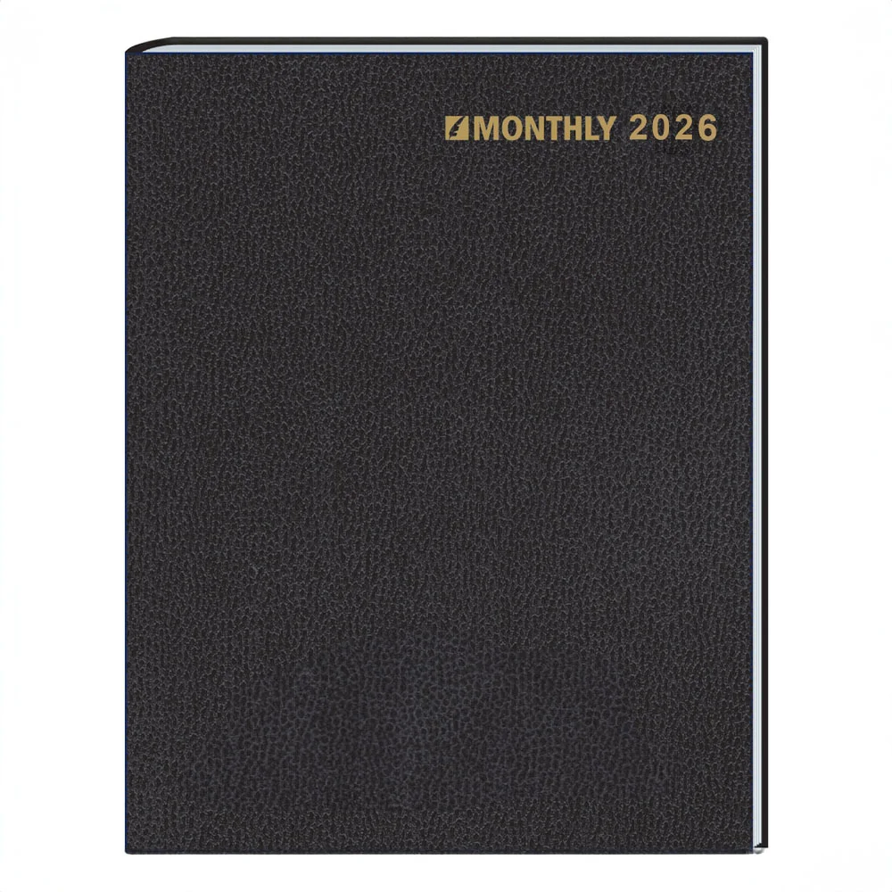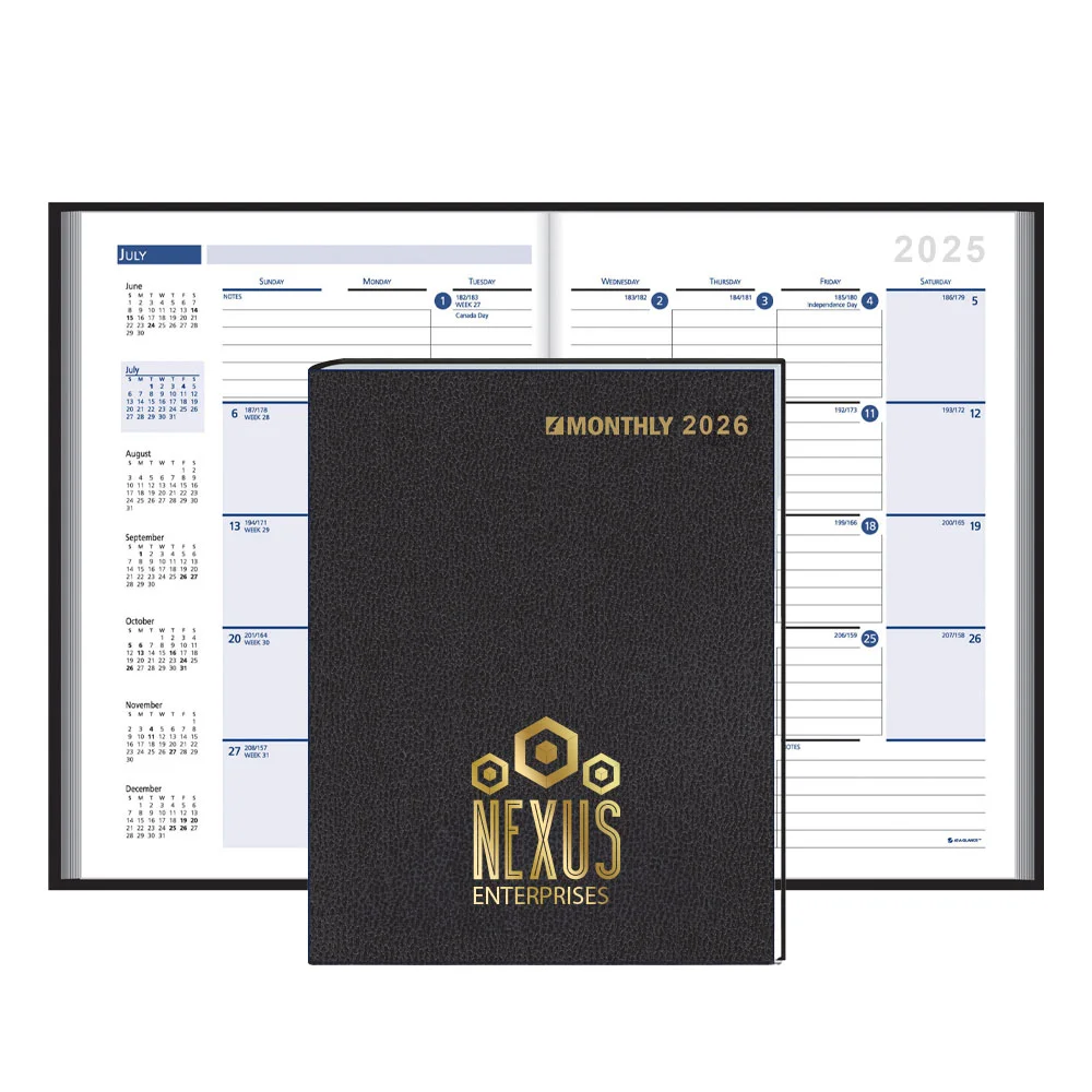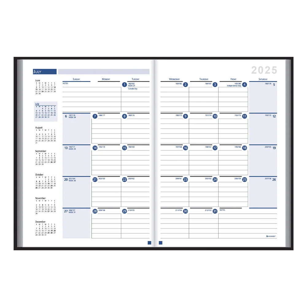 Ruled format, seven monthly calendar blocks per spread and screened weekends