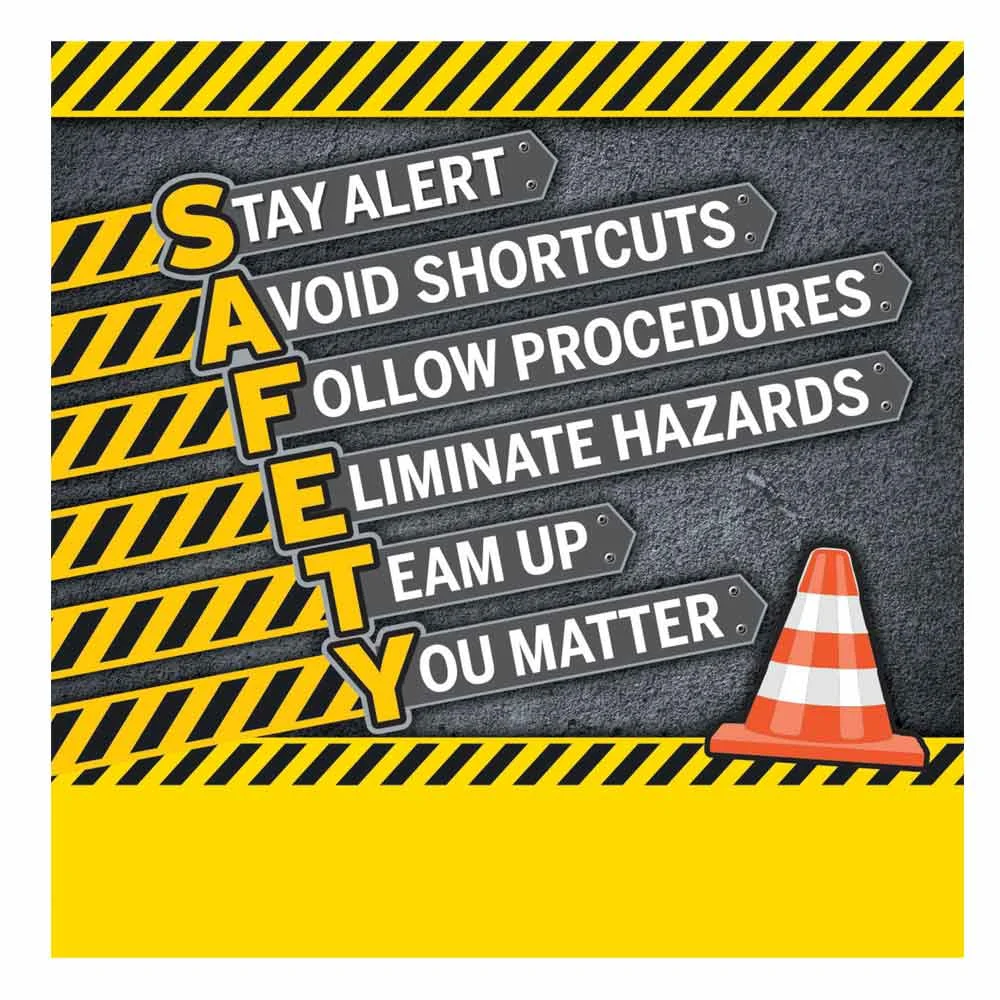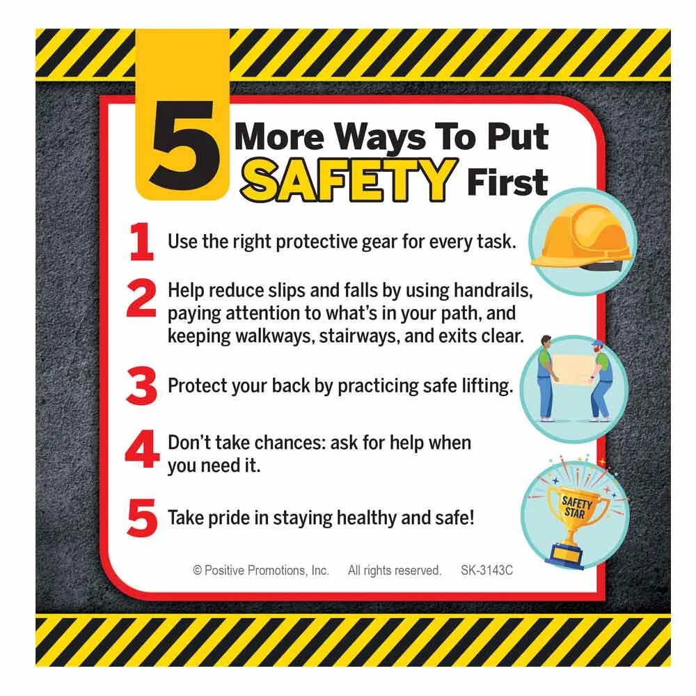 • Card uses the word SAFETY to spell out essential tips: Stay alert, Avoid shortcuts, Follow procedures, Eliminate hazards, Team up, You matter