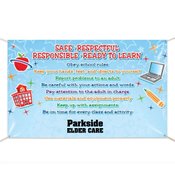 Colorful school-themed design lists rules kids should follow, including: Keep your hands, feet, and objects to yourself; Use materials and equipment properly; Keep up with assignments; And 5 more