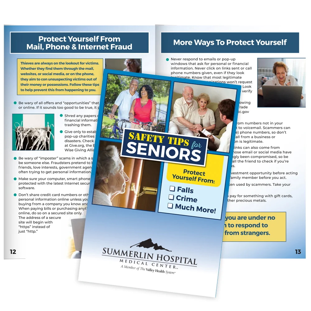 Addresses driving safety, fire safety, emergency preparedness, medication safety, home security, exercises for balance and injury prevention, and fraud and scam prevention