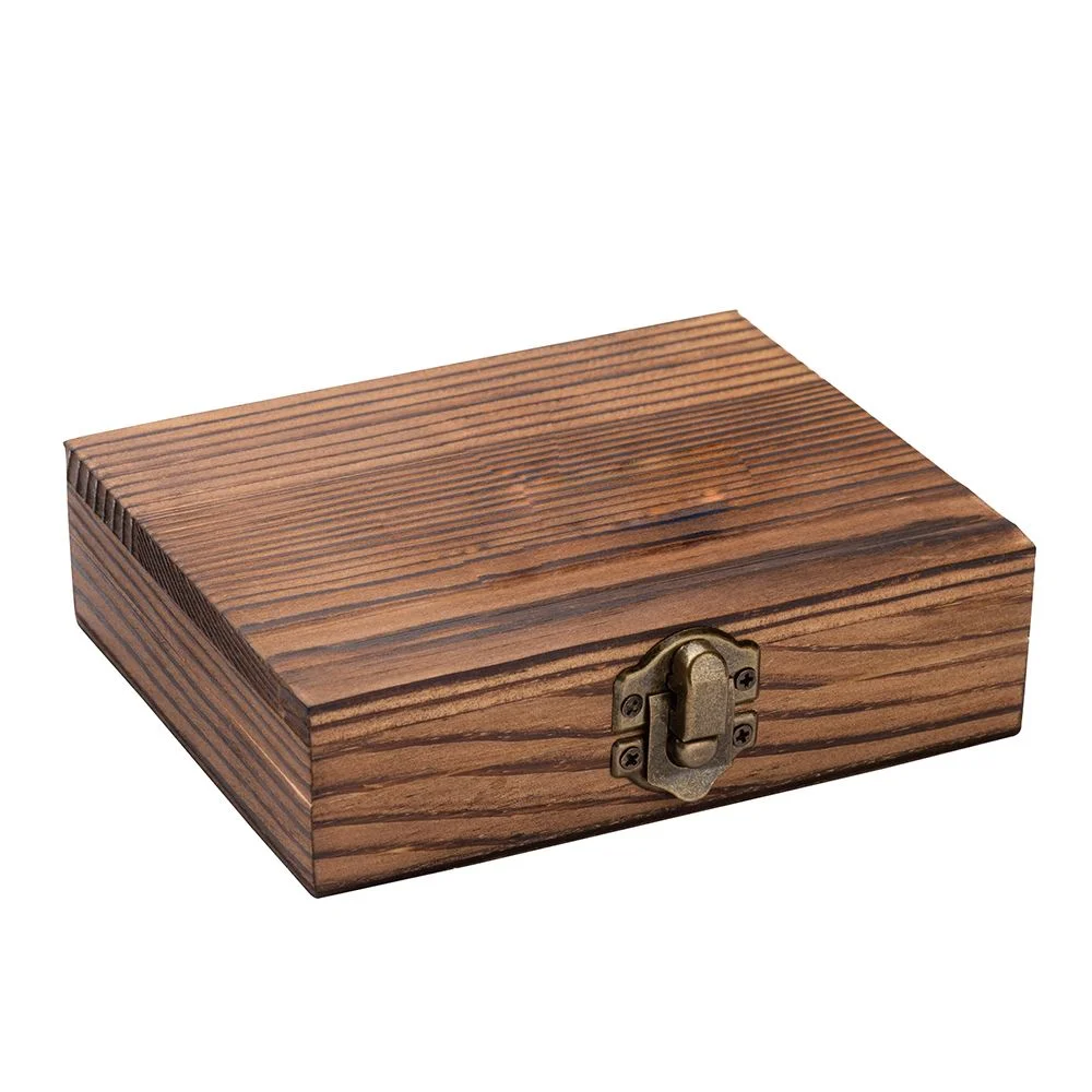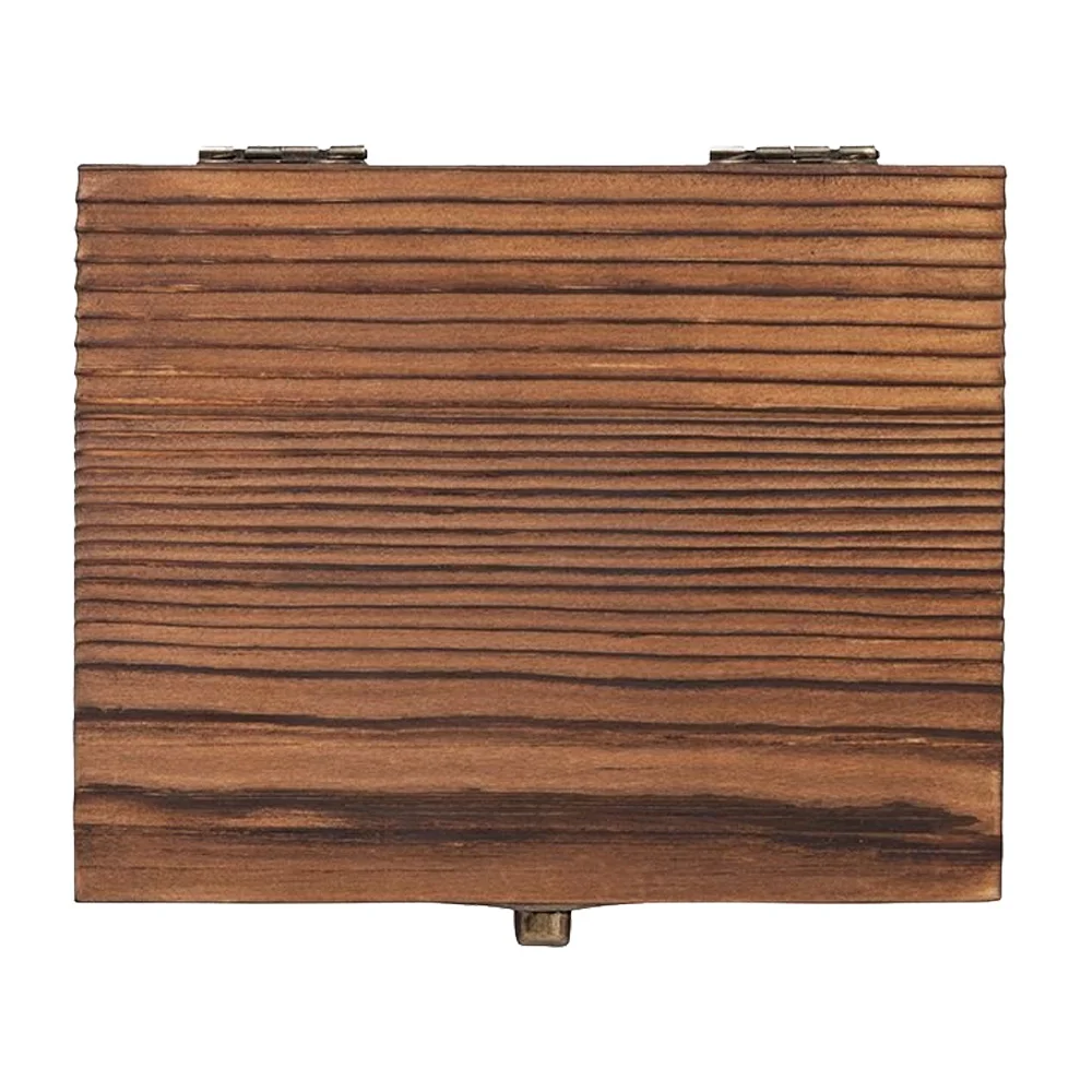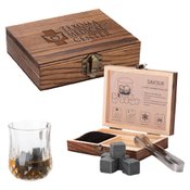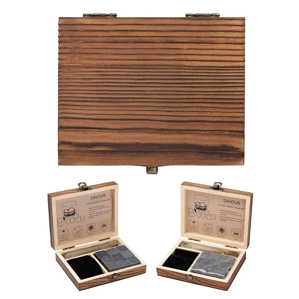 The Savour Whiskey Stone Set comes with 9 freezer-ready basalt stone ice cubes, 1 drawstring bag, and 1 pair of tongs - all enclosed in a vintage-style hinged wooden box