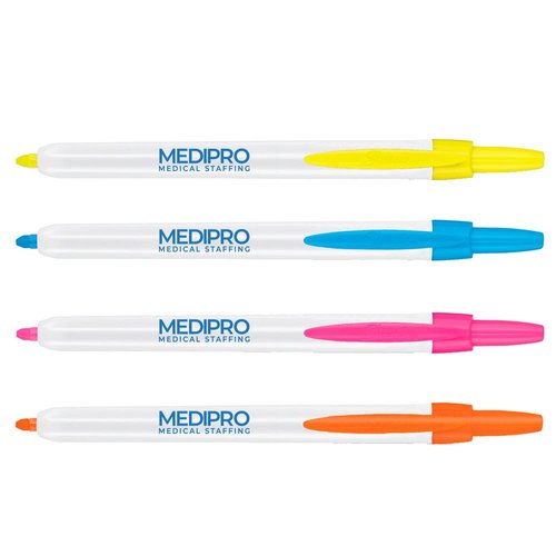 Highlighting has never been this easy with the Sharpie highlighter RT no more caps to lose, just quick-drying, vibrant colored inks with imprint-friendly white barrels and trims to match the ink color at the click of a button