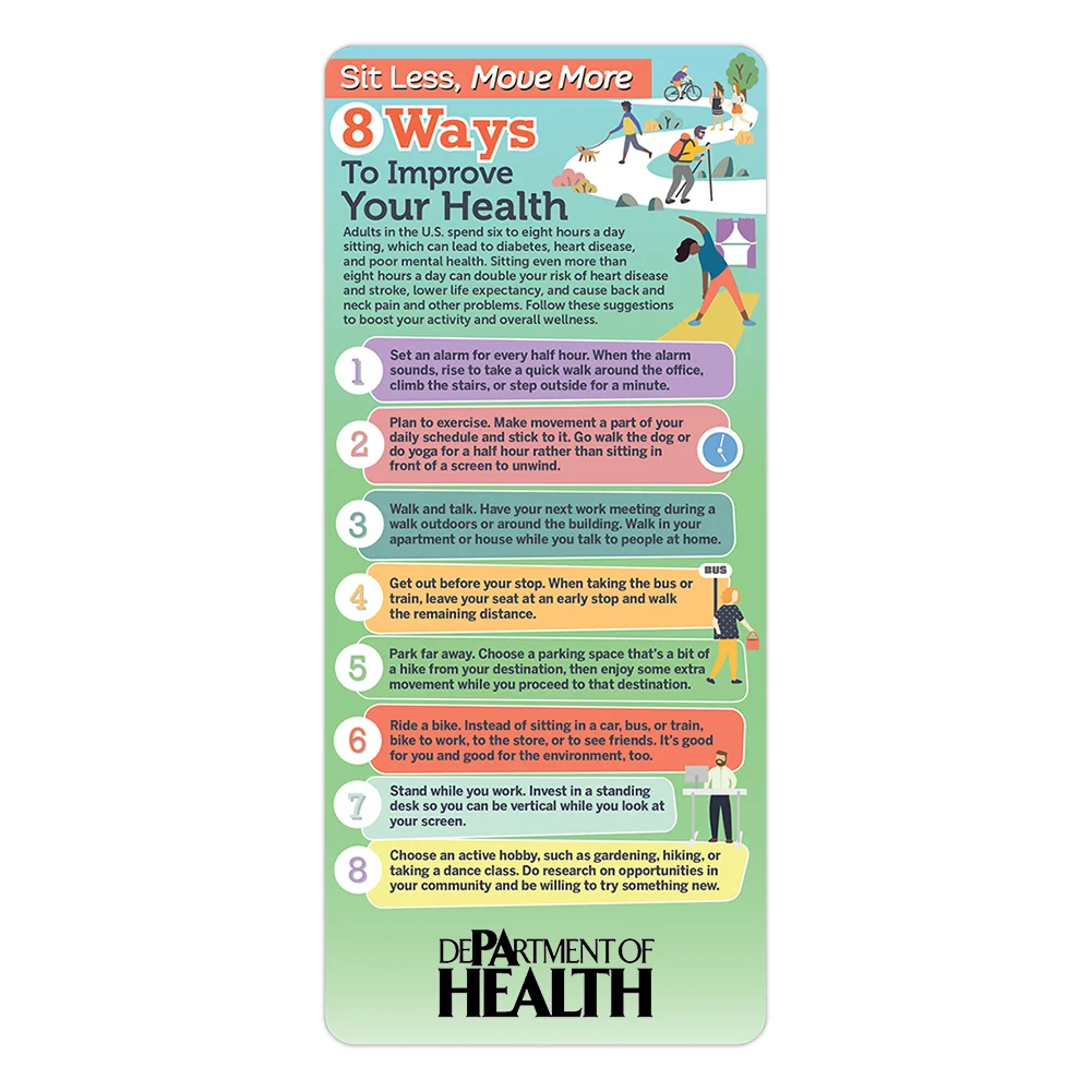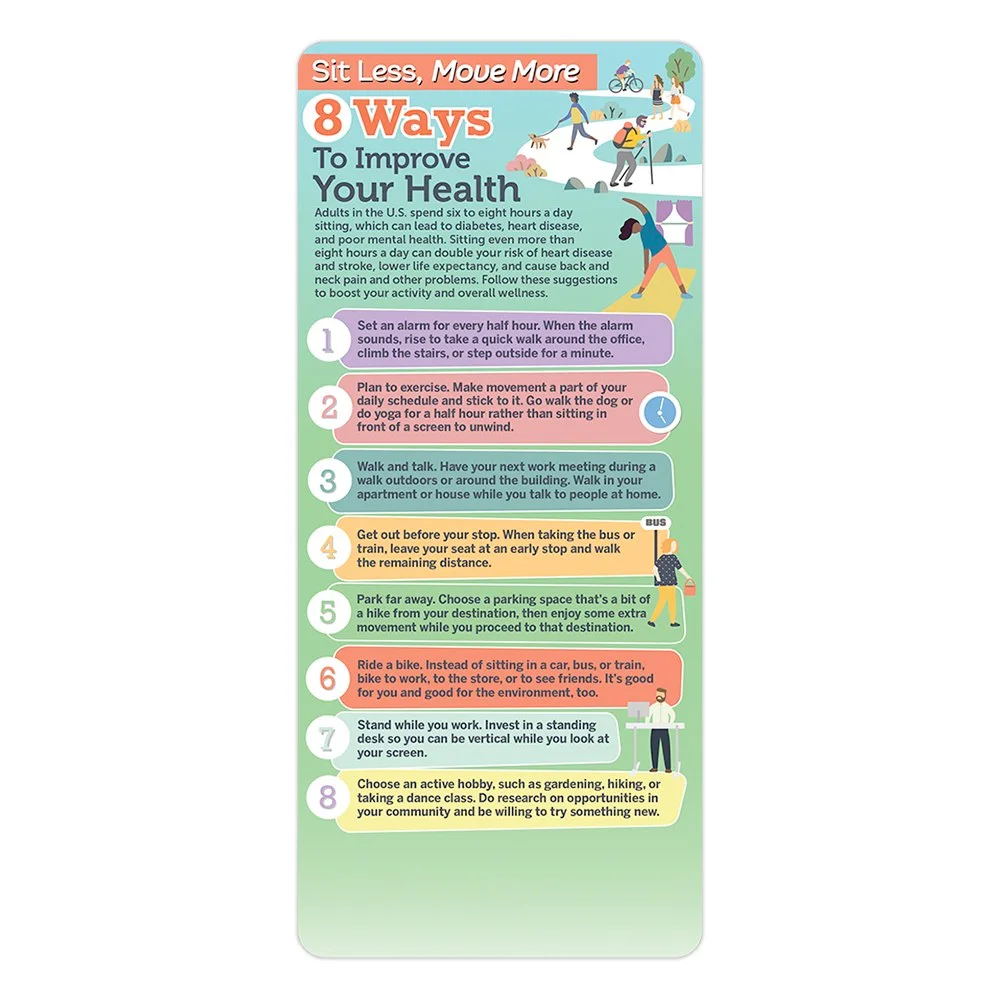 Features tips, such as Set an alarm for every half hour. When the alarm sounds, rise to take a quick walk around the office, climb the stairs, or step outside for a minute and Stand while you work. Invest in a standing desk so you can be vertical while you look at your screen