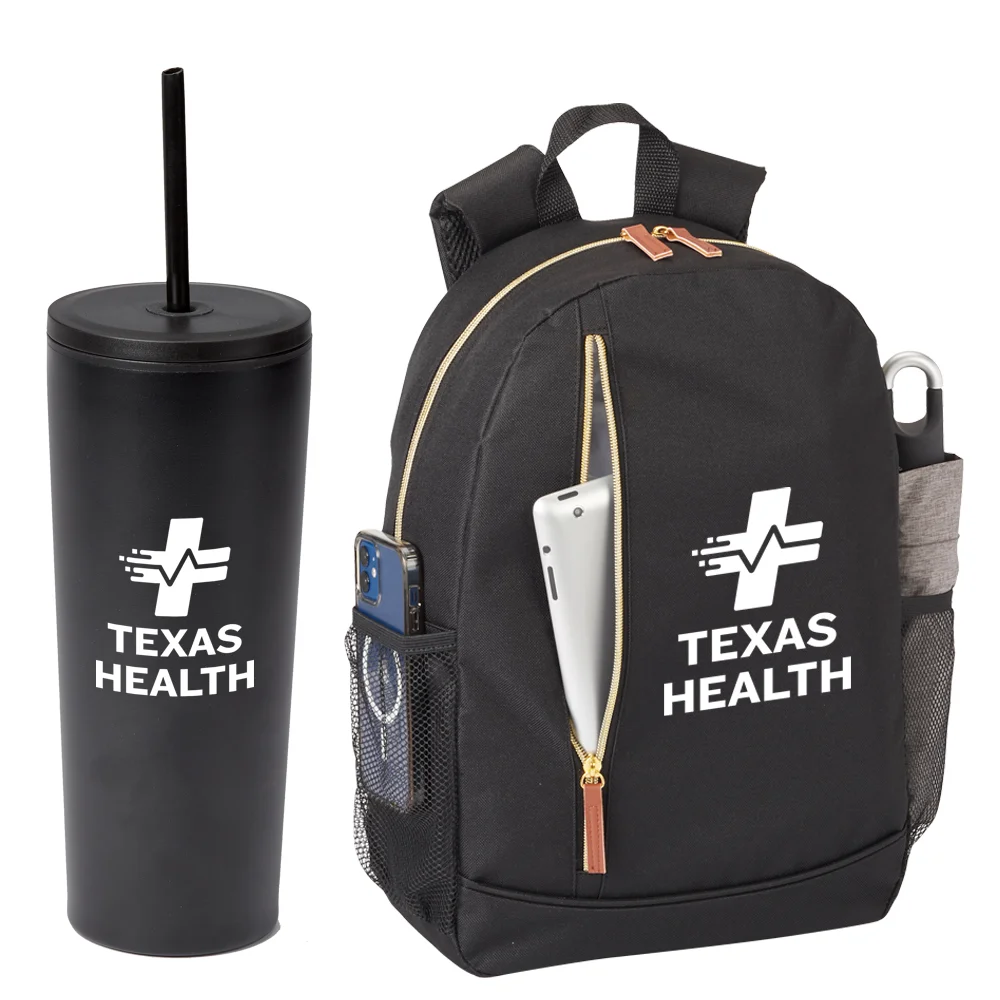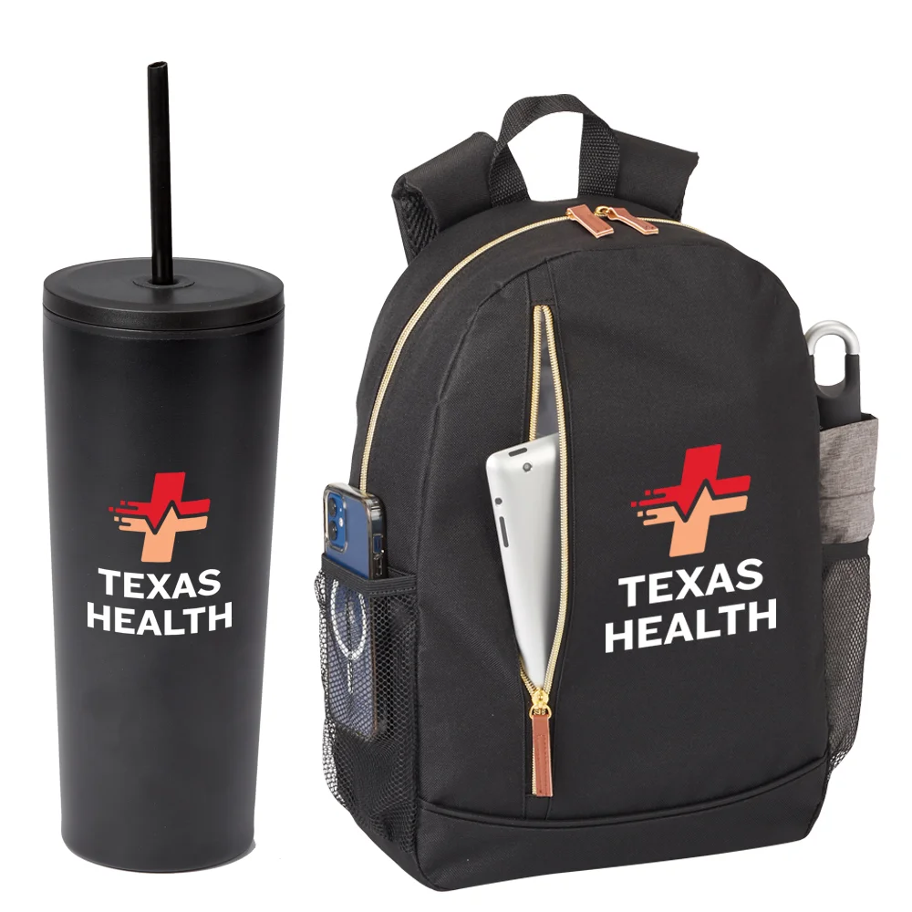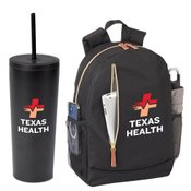 2-piece gift set includes: Sleek Stainless-Steel/Plastic Tumbler With Dual Lids 24 oz. & Axel 15" Laptop Backpack