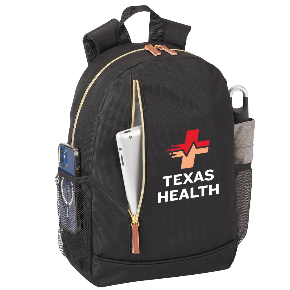 Personalized Backpack: Roomy main compartment with double-zip access; Interior padded laptop sleeve fits most laptops up to 15"; Vertical zip front pocket totes a tablet; Front or side entry to access belongings quickly; Mesh pocket on each side for water bottles, umbrellas, & more; Refined details: gold-trimmed zippers and tan leatherette pulls; Back panel and adjustable straps cushioned for all-day comfort; Top loop for quick grab and go; Trolley strap on back slips over luggage handles for travel ease; 600-denier polycanvas