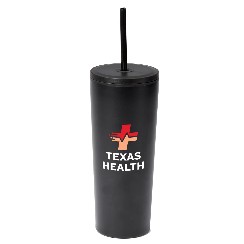 Personalized 24-oz. Tumbler With Dual Lids: Double-wall insulated: stainless-steel exterior and plastic liner maintain temperature for hours; 2 insulated lids: Leak-proof flip lid for hot drinks; Splash-proof straw lid for cold drinks; included straw slides through center; No-slip, no-sweat powder-coat finish; Tapered to fit most car cup holders; Eco friendly; Reusable; BPA free; Note: Hand wash only