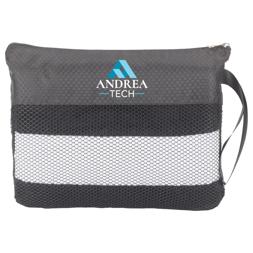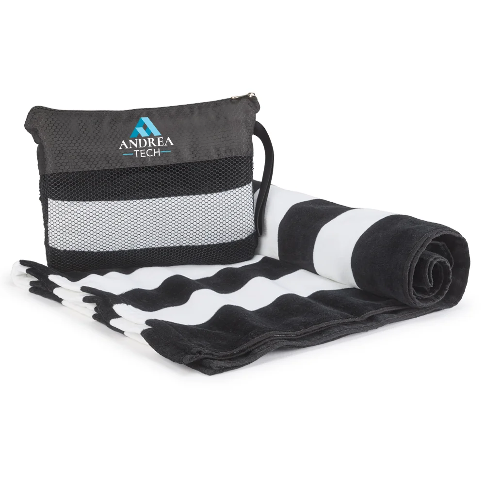Personalized Towel in Bag: Ultra-soft and highly absorbent 100% cotton terry velour; Fully hemmed; Printed, fade-resistant stripes for a classic look and a splash of style whether swimming or sunning; Zip-shut carry bag with wrist strap does double duty keeping phone, wallet, and more secure; Rip-stop nylon mesh releases sand with ease; Measures 30"x 60" unfolded; Plenty of room to lounge, wrap up, or dry off; Machine wash and dry