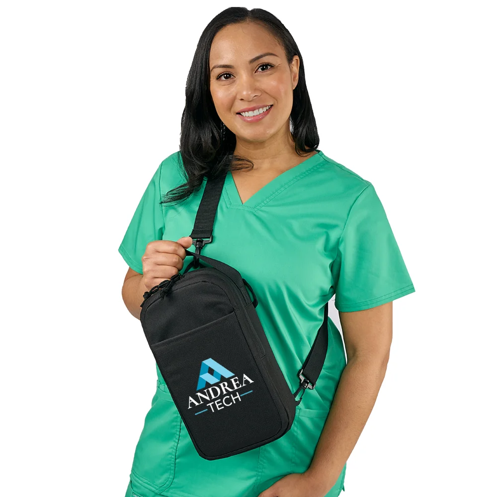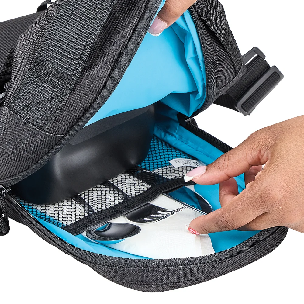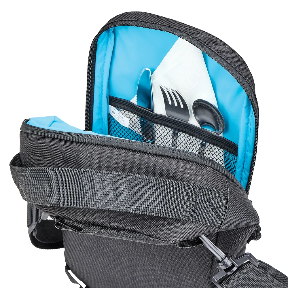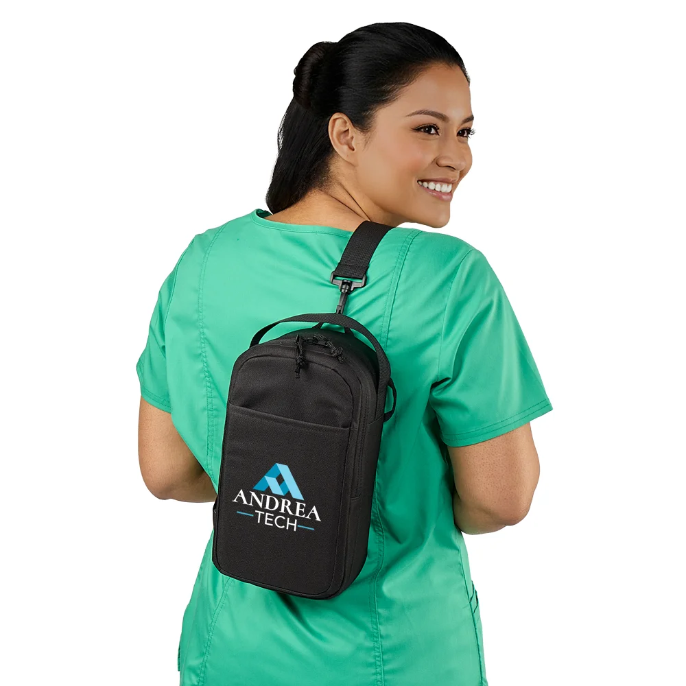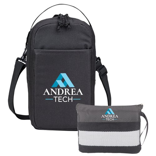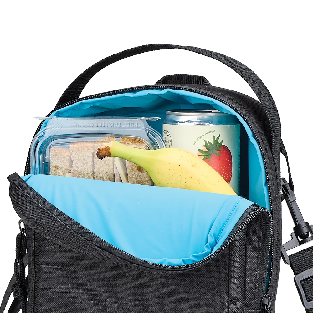 Personalized Lunch/Cooler Bag: Insulated and lightweight: leak-resistant compartment with easy-open double zipper and mesh interior pocket; Holds up to 4 cans plus sandwich or food container; Flexible carry: sling strap across chest or back, carry over shoulder, or use grab handle to carry in hand; Front slip pocket; Adjustable, detachable strap with quick-release carabiners can be clipped to left or right side; 600-denier polyester with blue PEVA lining