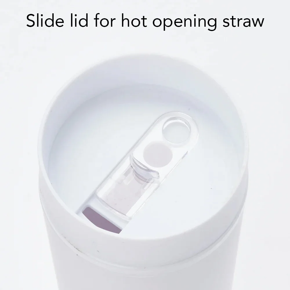• Straw port opening for cold drinks; Reusable soft straw included; Slips through straw port; Stopper on end prevents spills and keeps it in place