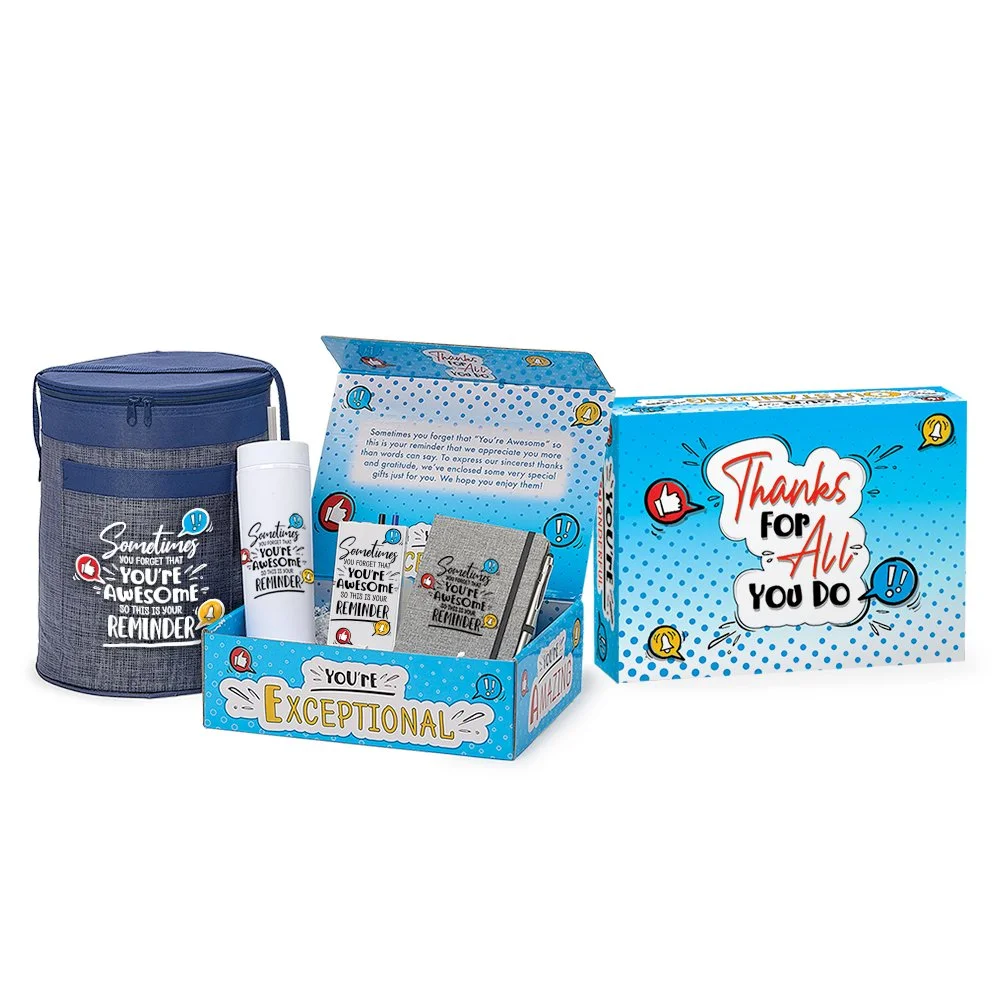Gift box included; Message inside lid: Sometimes you forget that "You're Awesome" so this is your reminder that we appreciate you more than words can say. To express our sincerest thanks and gratitude, we've enclosed some very special gifts just for you. We hope you enjoy them!