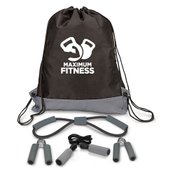 Convenient kit is the perfect way to get in a fast workout. Includes black-and-gray cinch backpack with essentials inside: chest expander, handgrip, and jump rope. Each piece of flexible equipment features a rubber-and-foam grip with thick, layered bands for extra ergonomic comfort. Your imprint displayed on the backpack.