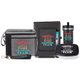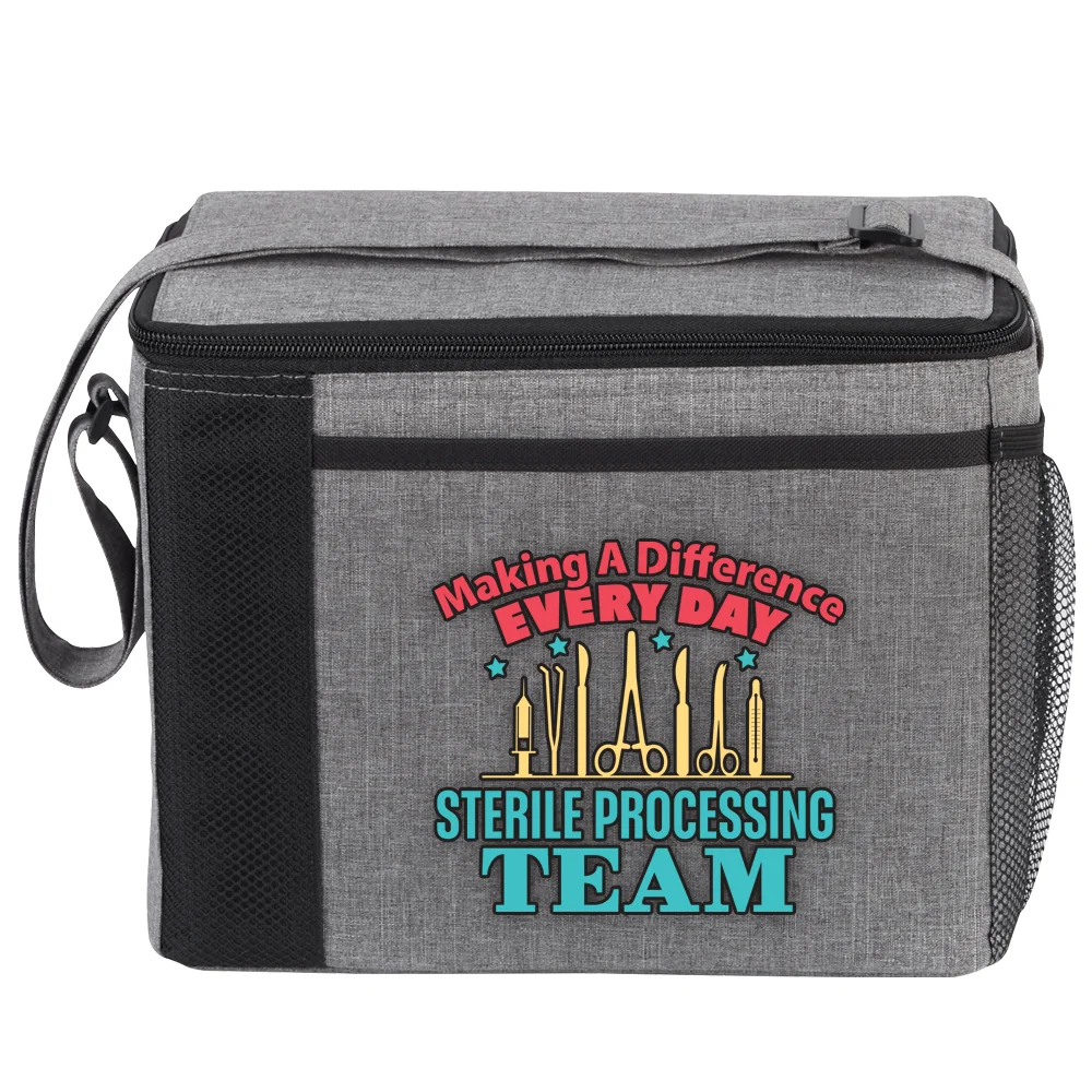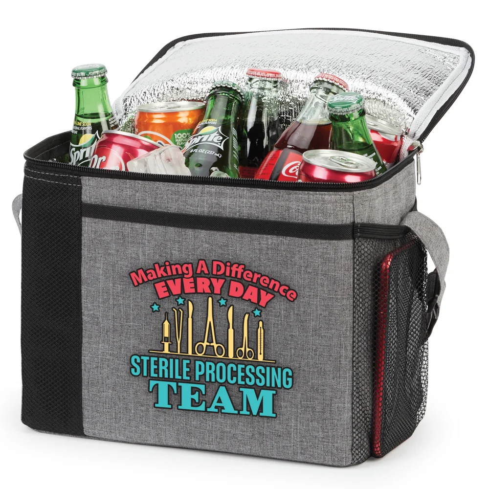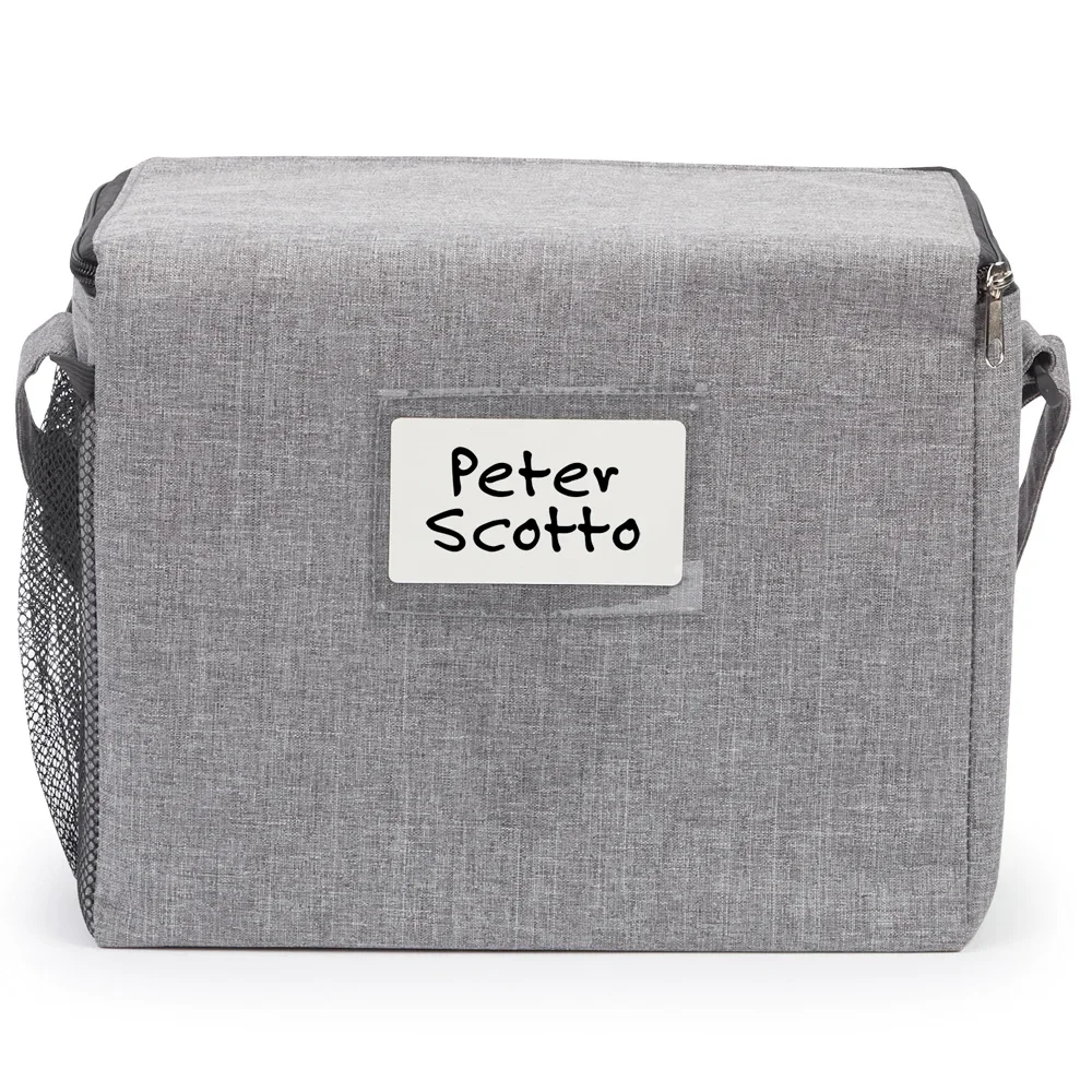 Grayson Lunch/Cooler Bag: Flip-top lid; Zip-around closure with two zipper pulls; Front slip pocket; Side mesh pocket; Insulated lining is easy to wipe clean; Strap adjusts for hand or shoulder carry; ID window; Holds up to 8 cans; Heathered 300-denier polyester