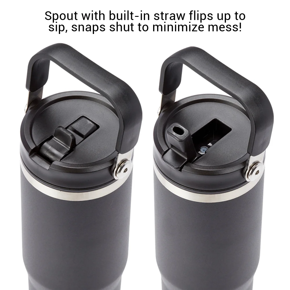 Coldflow Double-Wall Flip-Straw Bottle 30 oz. With Carry Handle: Double-wall insulated: stainless-steel exterior, plastic liner; Leak-resistant lid with spout & built-in, flip-up straw; Snaps shut; Handle swings up; Powder-coated finish resists scratches, stops condensation; Fits most car cup holders; Eco friendly; Reusable; BPA free; Note: Hand wash