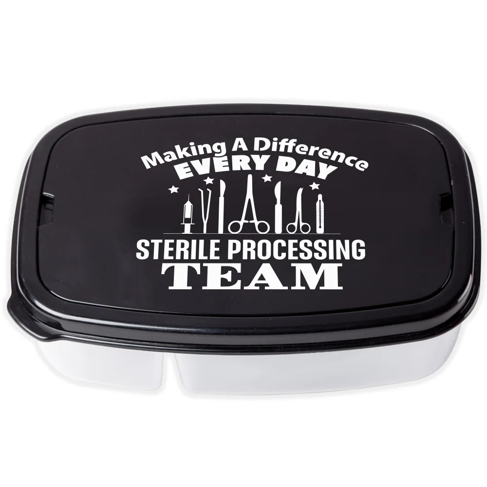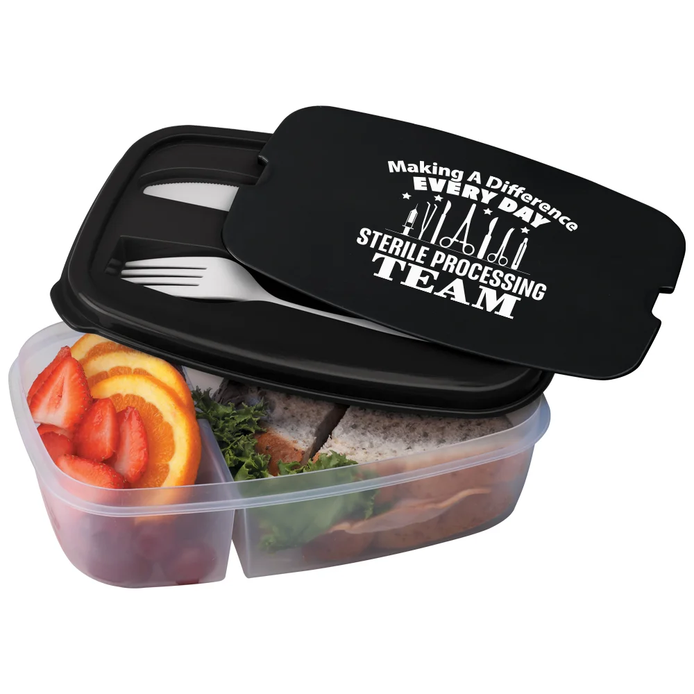 2-Section Food Container With Utensils: Plastic; Tight-fitting compartment lid; Includes plastic fork and knife beneath protective cover; Fits in most lunch bags; Microwave, freezer, and dishwasher safe; Eco friendly; Reusable; BPA free; Note: Do not use with foods with high sugar or fat content