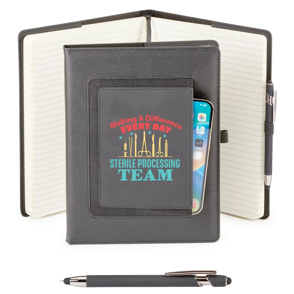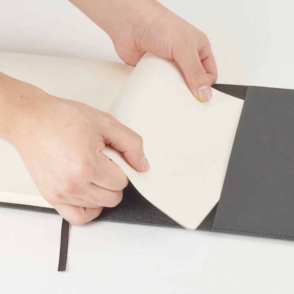 Emerson 7 1/2" x 10" Refillable Journal With Phone Pocket & Dual-Stylus Pen: Large size; Textured cover; Side-entry front phone pocket; 96 lined pages of FSC®-certified 70-g. paper; Removable/refillable with standard B6 notebook (not included); Ribbon bookmark; Elastic pen loop; Dual-Stylus Metal Pen included; Black ink