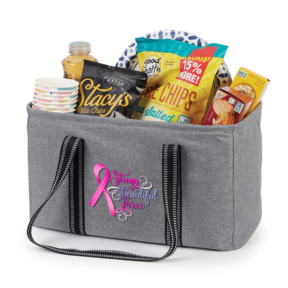 Tote: Large main compartment with wire rim to hold its shape; Collapses flat for easy storage; Stable base makes it easy to load and unload; Carries groceries, clothing, and daily essentials; Dual 33.5" black web carry handles; 600-denier polyester