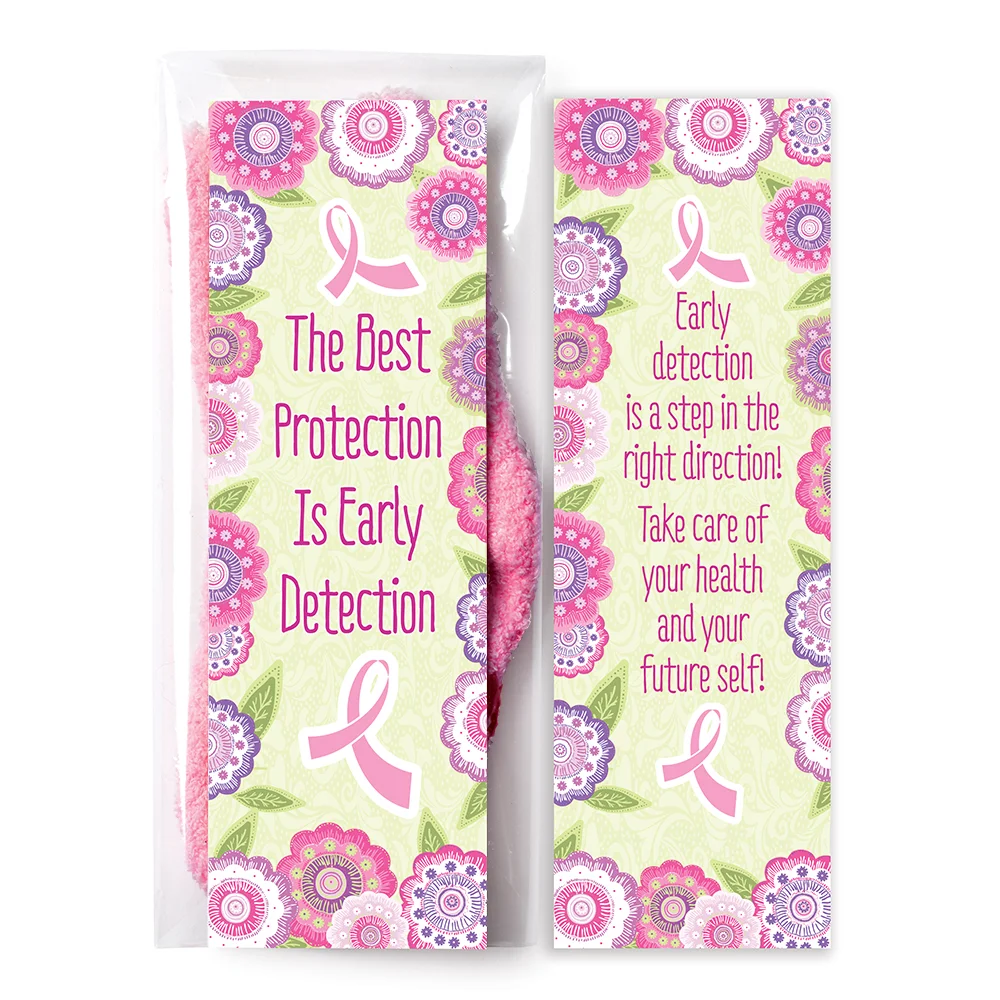 Slipper Socks: Soft, ultra-cozy polyester socks keep feet warm and toasty; Slip on after being on your feet all day or while relaxing at home; Pull on easily; Non binding; Pretty pink color with pink ribbon non-skid grippers on the soles and pink ribbon at ankles and toes; One size fits most women; Easy care; Machine wash and dry; Polybagged with a FREE colorful card