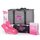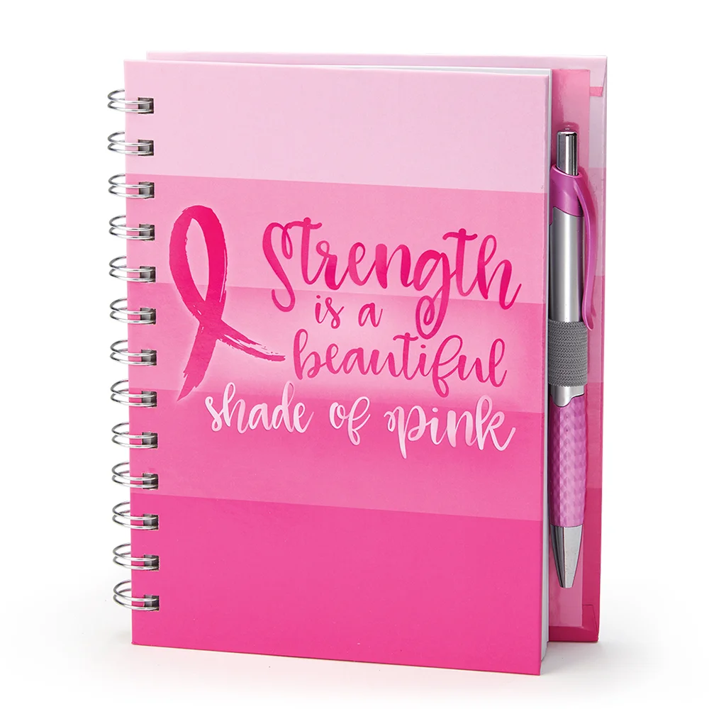 Notebook & Pen: Hard glossy cover designed in multiple shades of pink; Spiral bound with 100 lined pages; Elastic pen loop; Pretty pink-accented silver pen with rippled comfort grip included with each journal
