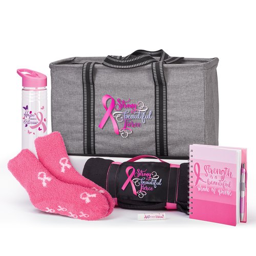 Water Bottle: 24-Oz.; Lip Balm: 2 5/8" X 5/8";, Blanket:60" X 48";, Notebook:5 3/4" X 6 7/8"; Pen: 5 1/2", Ink Color: Black, Tote: 17 1/4" X 9" X 9 1/2"; Socks: One Size Fits Most Women