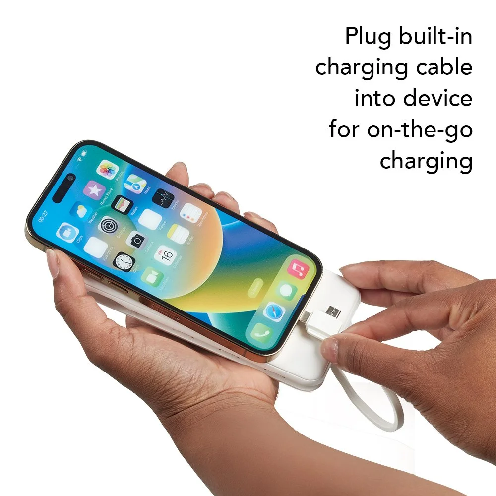 • Plug built-in charging cable into device for on-the-go charging