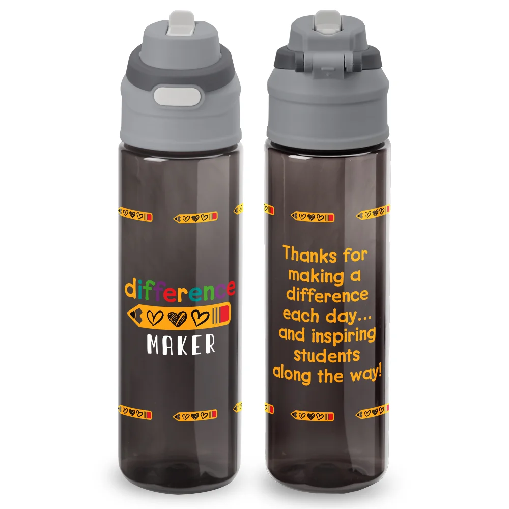 28-oz. Water Bottle: Dual-function, push-button, spill-proof locking lid; Sip: flip up built-in spout to sip through internal straw; Chug: push button to unlock lid and access the wide opening; Extra-wide mouth for easy filling and cleaning; Easy-carry loop built into lid; Tough, impact-resistant, and shatter-resistant Tritan™; Eco friendly; Reusable; BPA free; Note: Hand wash recommended
