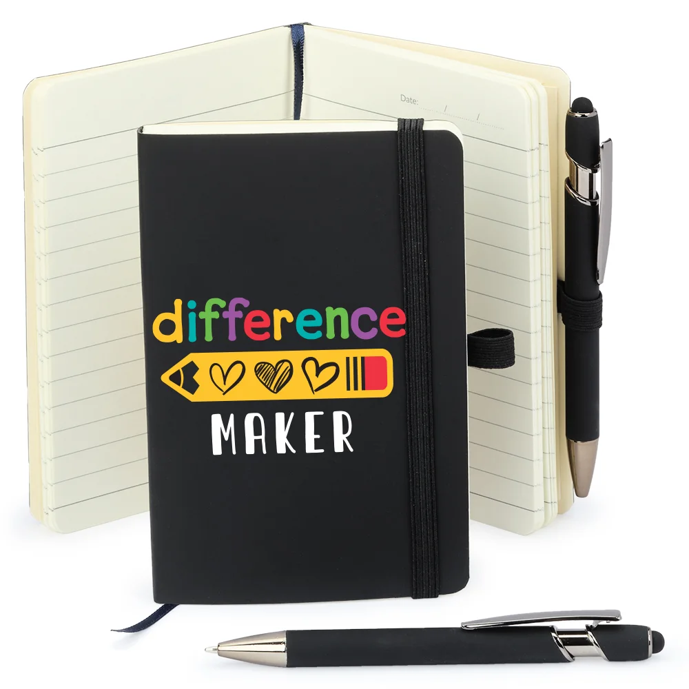 Mini Journal & Stylus Pen: Compact journal with soft-touch cover; 80 lined FSC®-certified pages with space to record entry date (month/day/year) at top of each right page; Ribbon page marker; Pocket for business cards or loose notes in back cover; Elastic strap and pen loop; Sleek mini stylus pen with smooth metal barrel and titanium accents; Black ink; Stylus navigates touchscreens