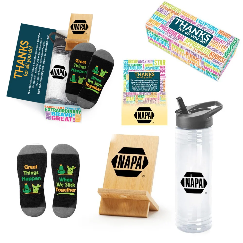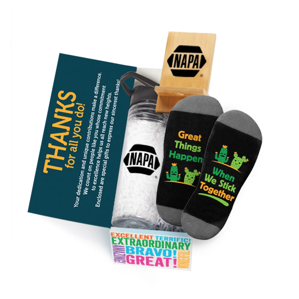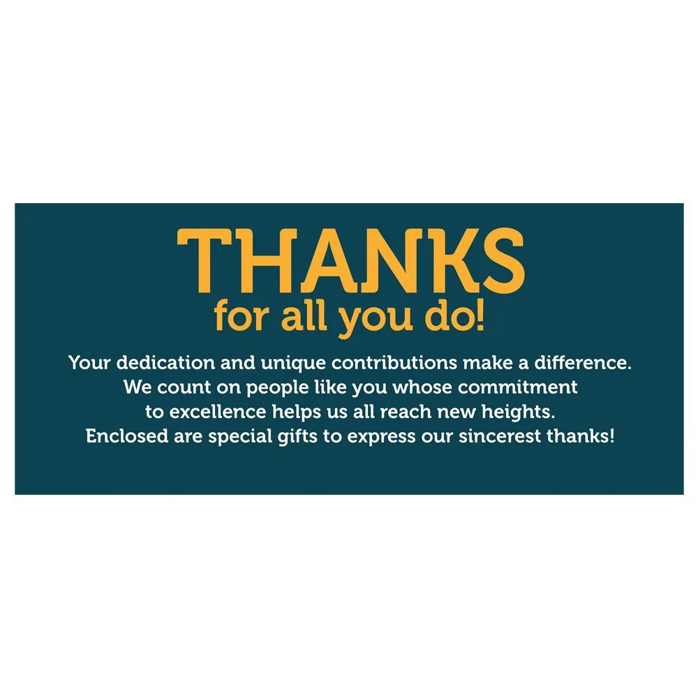 Gift box included; Message inside lid: Thanks for all you do! Your dedication and unique contributions make a difference. We count on people like you whose commitment to excellence helps us all reach new heights. Enclosed are special gifts to express our sincerest thanks!