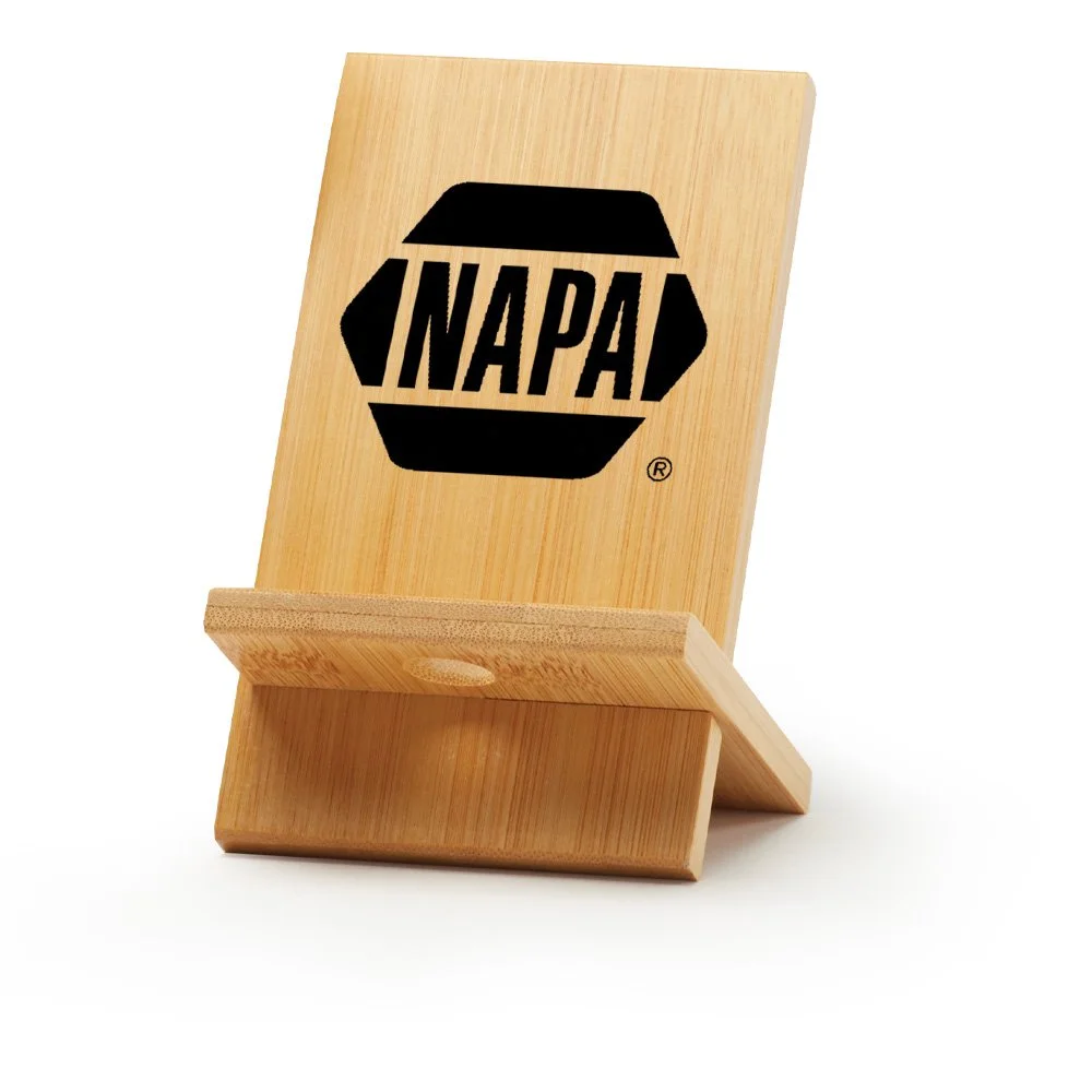 Personalized Phone/Tablet Holder: Jazz up any desktop; Sturdy, yet lightweight and versatile; Holds tablet, phone, or other device; Find the perfect viewing angle vertically or horizontally; Ideal for desk, nightstand, and more; Made from natural, eco-friendly, renewable bamboo; Convenient slot in base lets phone charge while still being able to view screen; Easy-to-assemble, two-piece design; Ships flat; Included card explains the eco-friendly benefits of Bamboo on front; Assembly instructions on back; Gift box included