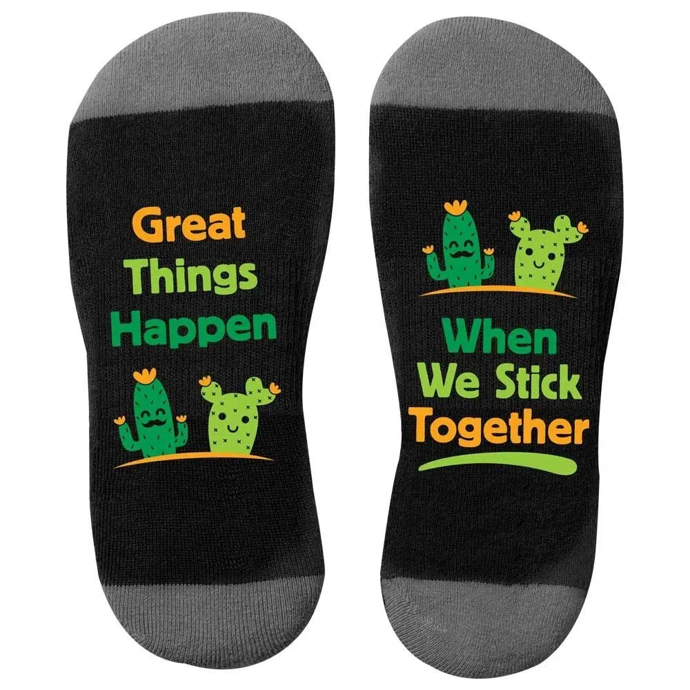 Ankle Socks: Cotton blend; Thick, cushioned soles offer comfort and relief after a long day; Color-accented heel & toe; Great Things Happen When We Stick Together design on soles can be read when recipients put up their feet to relax; Each pair comes polybagged with a FREE appreciation card; One size fits most