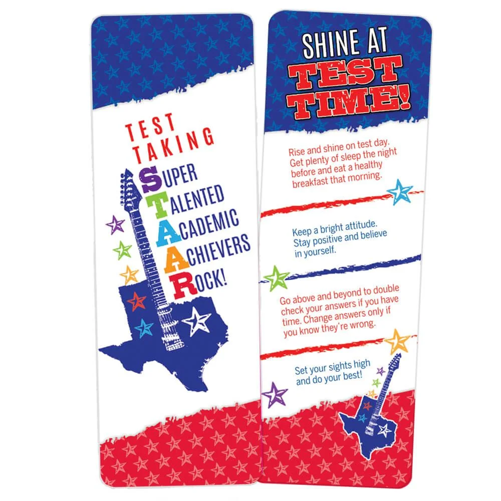 Colorful 2-sided bookmark celebrates the Test Taking STAAR students at your school with our musical design on front