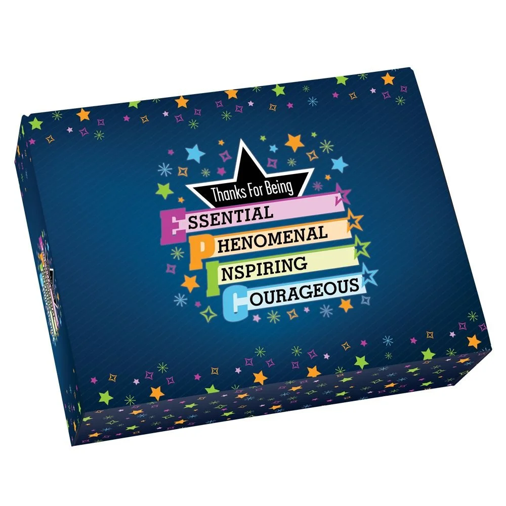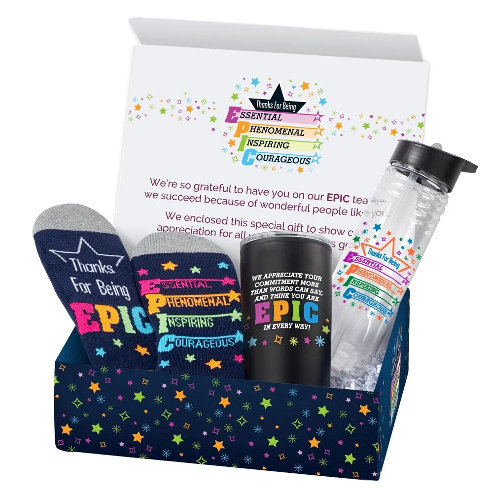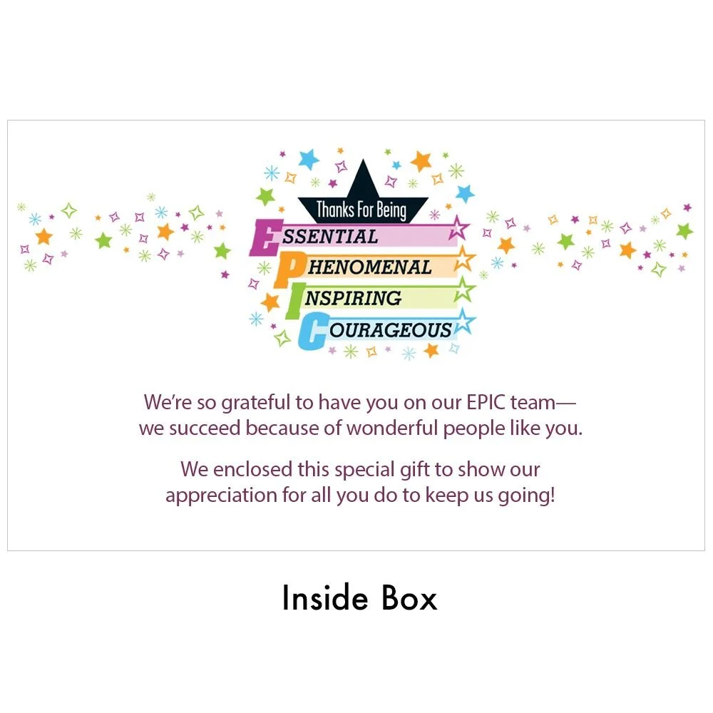 Gift box included; Message inside lid: We're so grateful to have you on our EPIC team - we succeed because of wonderful people like you. We enclosed this special gift to show our appreciation for all you do to keep us going!