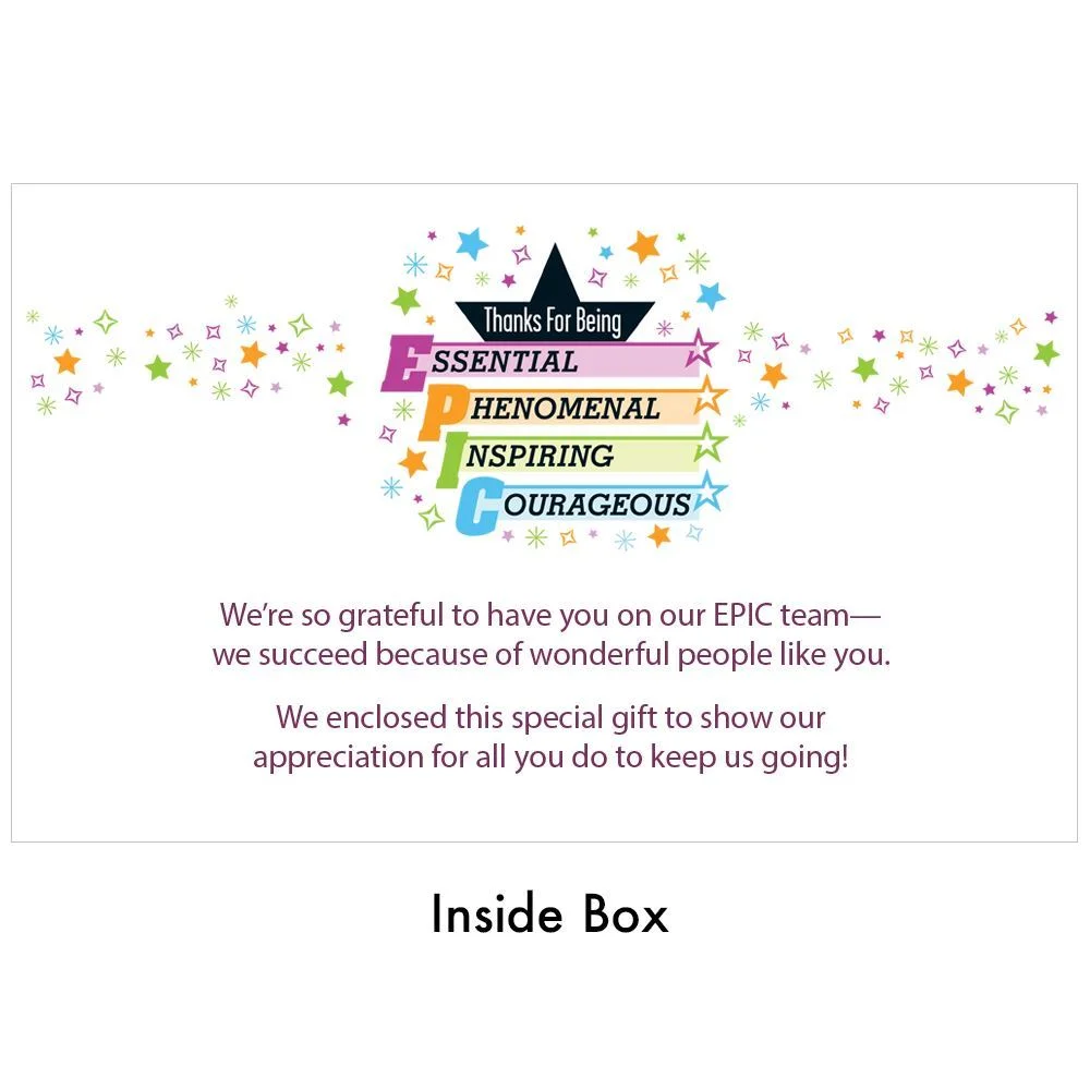 Message inside box lid: We're so grateful to have you on our EPIC team - we succeed because of wonderful people like you. We enclosed this special gift to show our appreciation for all you do to keep us going!