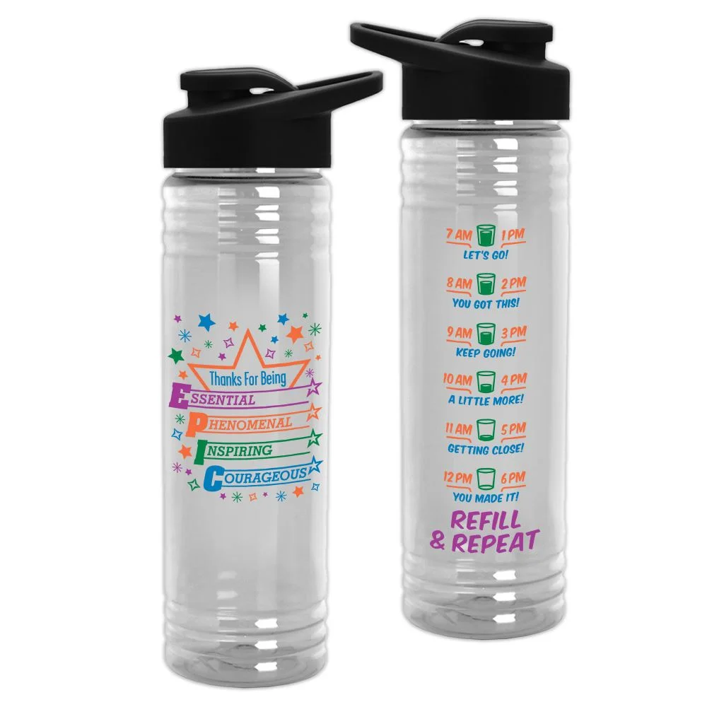 24-Oz. Bottle: Durable, lightweight, plastic sport bottle for healthful, grab-and-go hydration; Pop-open spout; Sport sipper lid with integrated carry handle; Wide mouth; Easy to fill with beverage, ice, or powdered drinks; Easy to clean; Eco friendly; BPA Free; Reusable; Appreciation verse on back; Note: Hand wash recommended