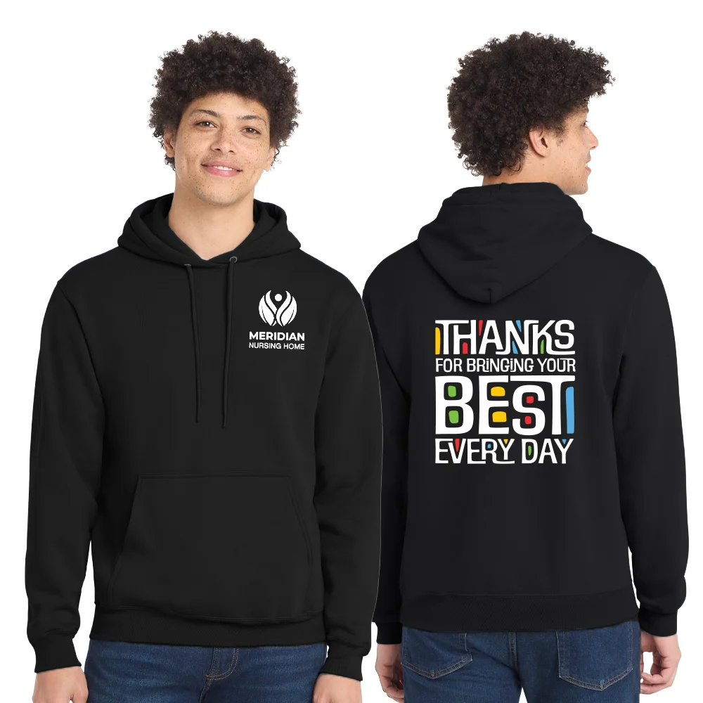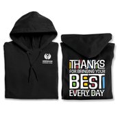 Features our exclusive Thanks for Bringing Your Best Every Day design on the back of the Hoodie; Warm Thanks for All You Do on the Quilted Tote
