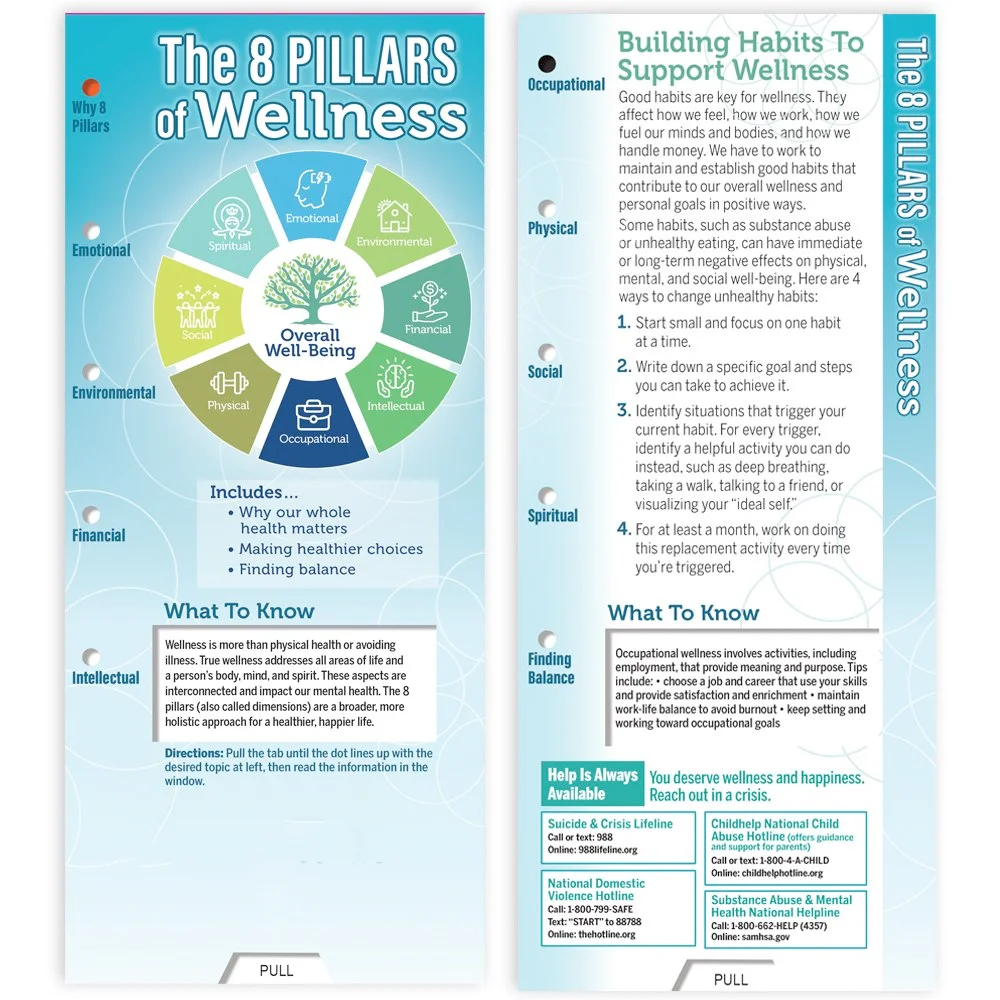 Pillars address Emotional, Environmental, Financial, Intellectual, Occupational, Physical, Social, and Spiritual health