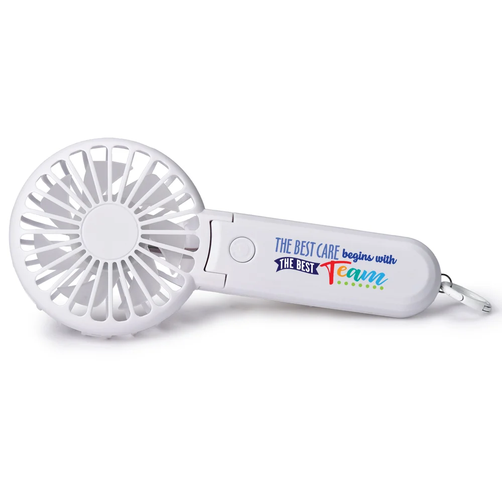 2-in-1 3-Speed Rechargeable Hand & Desk Fan: 3 speeds for custom cooling; Adjusts to any angle; Clip anywhere with easy-carry carabiner; Rechargeable; Up to 2-3 hours of cooling on a single charge; Charging time: 1.5 hours; Type-C USB charging cord and instructions included