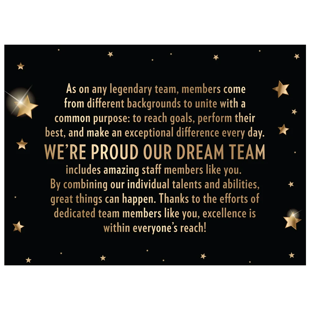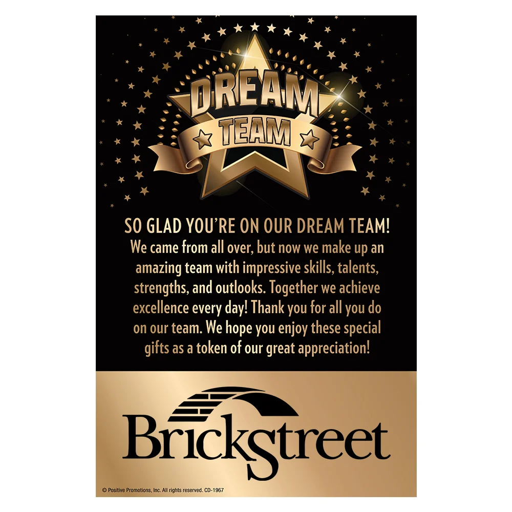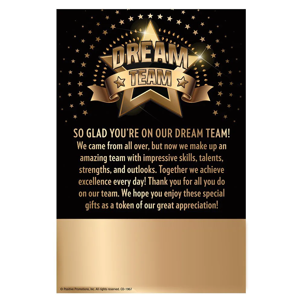Personalized Appreciation Card:So glad you're on our dream team! We came from all over, but now we make up an amazing team with impressive skills, talents, strengths, and outlooks. Together we achieve excellence every day! Thank you for all you do on our team. We hope you enjoy these special gifts as a token of our great appreciation.