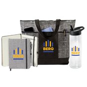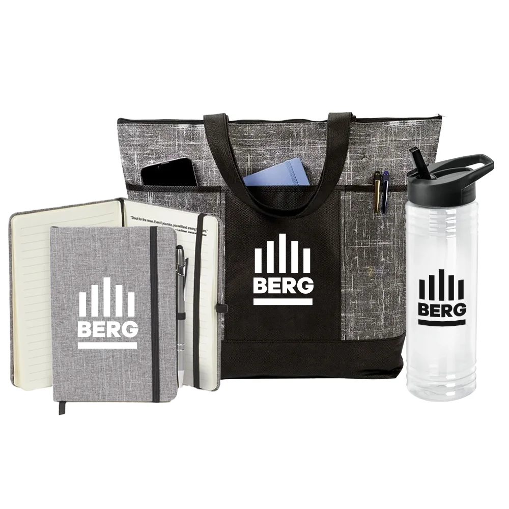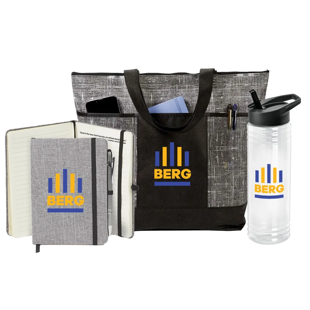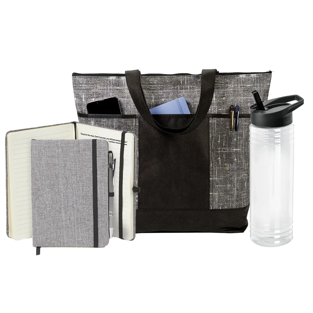 3-piece gift set includes: Heathered Journal With Quotes & Stylus Pen, Malibu Non-Woven Zippered Tote Bag, & Solara Water Bottle 24 oz.