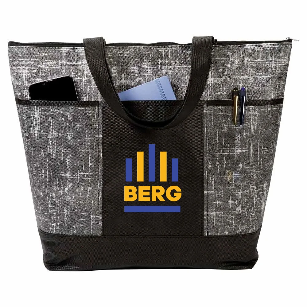 Personalized Tote Bag: Secure, zip-top tote with generous 5" bottom gusset; Three front pockets for grab-and-go essentials; Reinforced shoulder straps: Dual 25 1/4" carry handles in solid color coordinate with trendy distressed-look denim pattern; Non-woven polypropylene is eco friendly and recyclable; Reusable