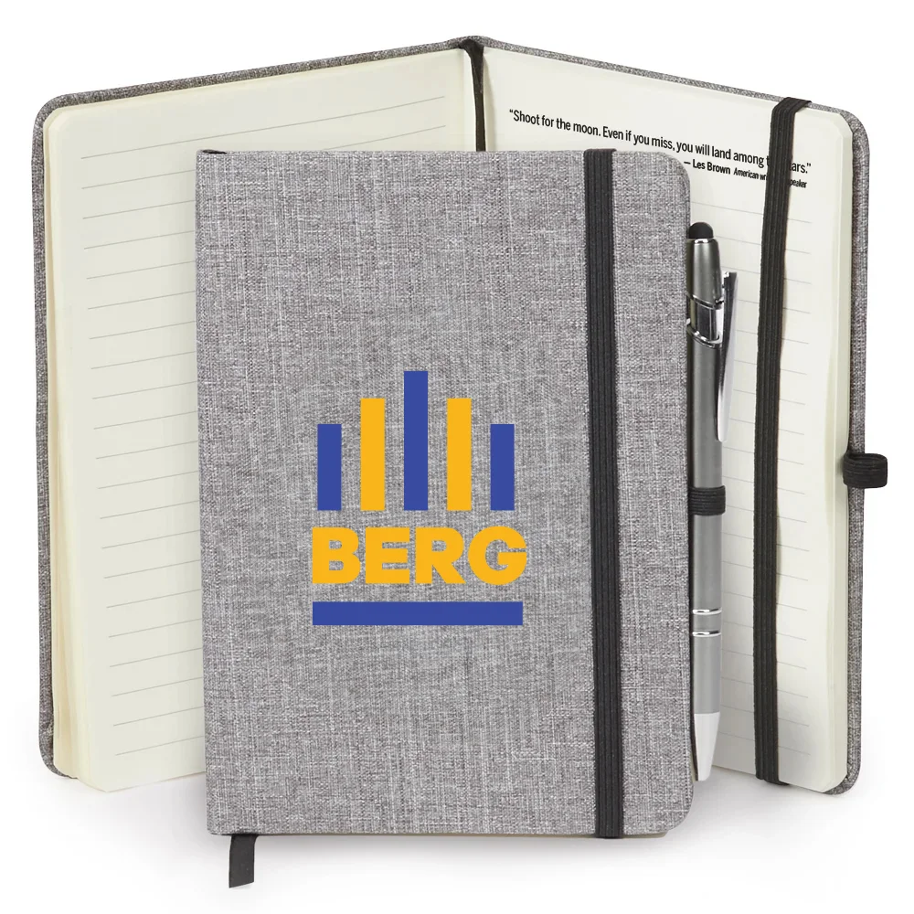Personalized Journal & Stylus: Heathered, linen-like hard cover; 80 lined pages; Includes inspirational quotes on the top of each right page; Ribbon bookmark, elastic closure, and elastic pen loop; Stylus Pen included for note-taking and touchscreen navigation; Black ink