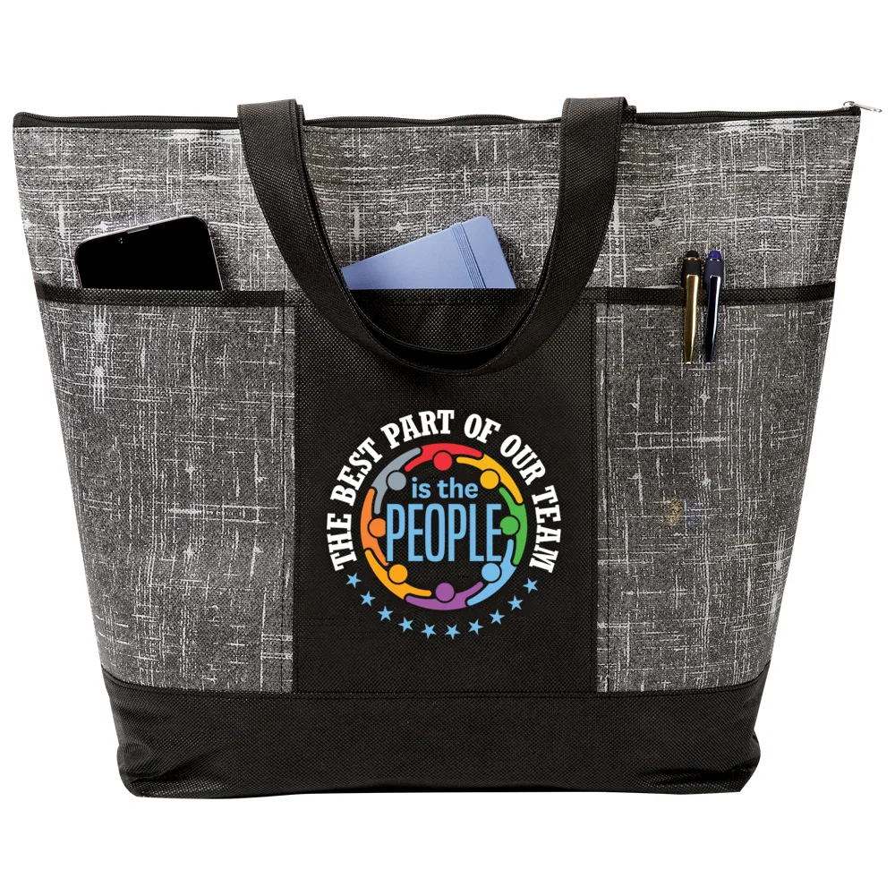 • Tote Bag: Carryall with distressed "denim" look and solid accents; Stylish, reusable alternative to single-use bags; Secure, zip-top tote with generous 5" bottom gusset; Three front pockets for grab-and-go essentials; Reinforced shoulder straps: Dual 25 1/4" carry handles in solid color coordinate with trendy distressed-look denim pattern; Non-woven polypropylene is eco friendly and recyclable; Reusable
