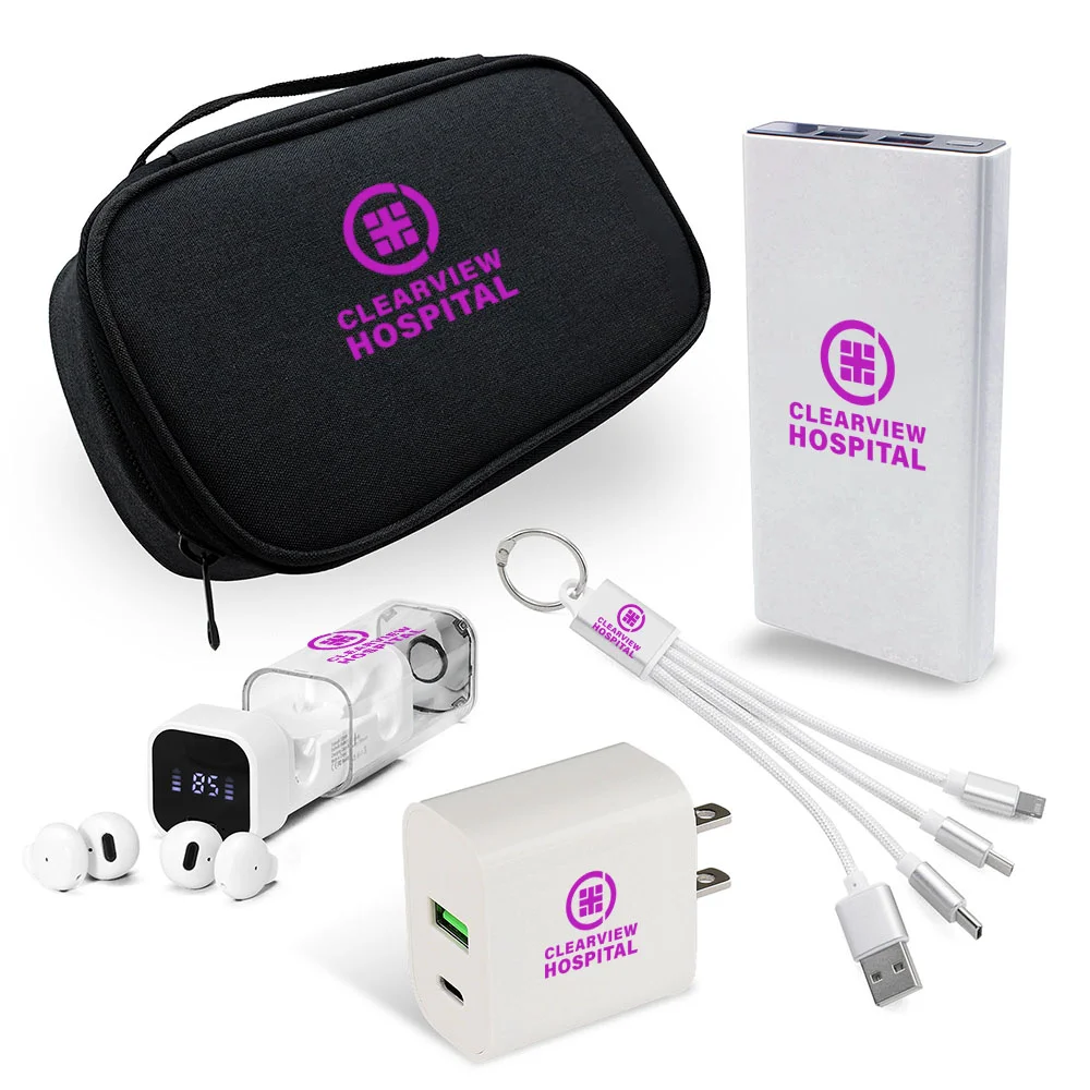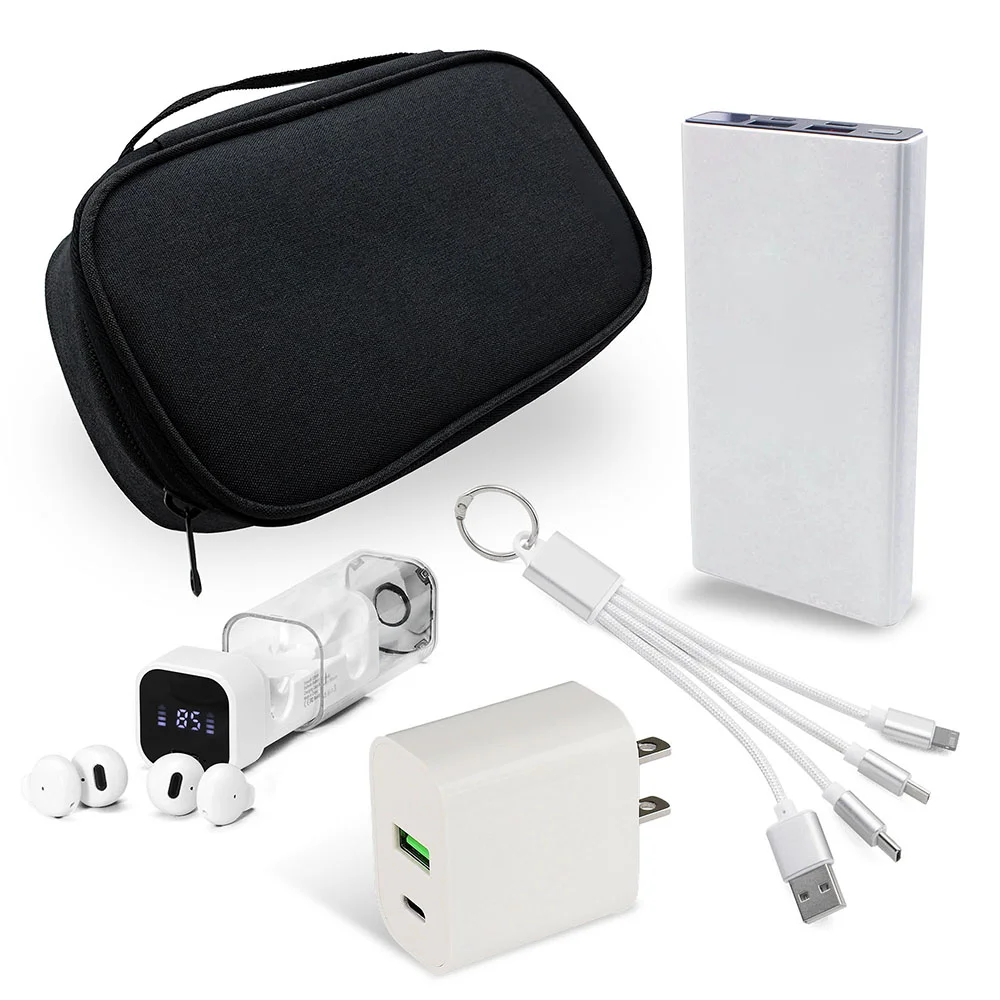 This kit includes a wireless power bank, a dual port adapter, a petit keychain cable, andstylish clip on earbuds to stay aware of your surrounding