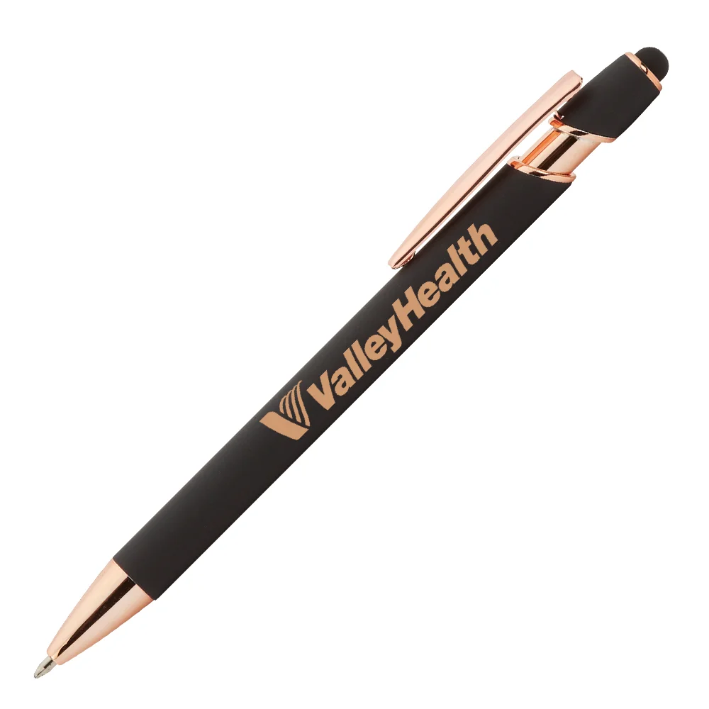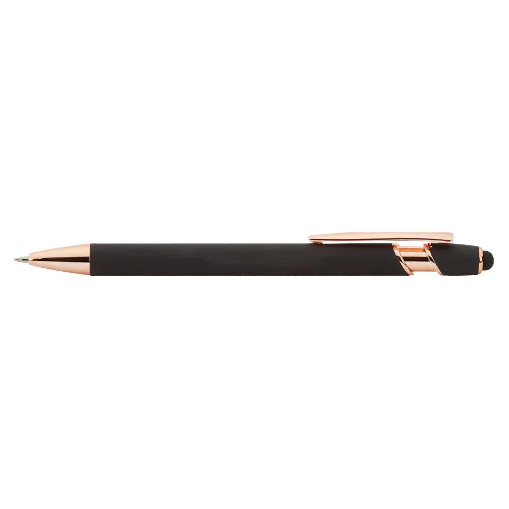 • Premium metal stylus pen with metallic, rubberized, satin finish in black with elegant rose-gold trim