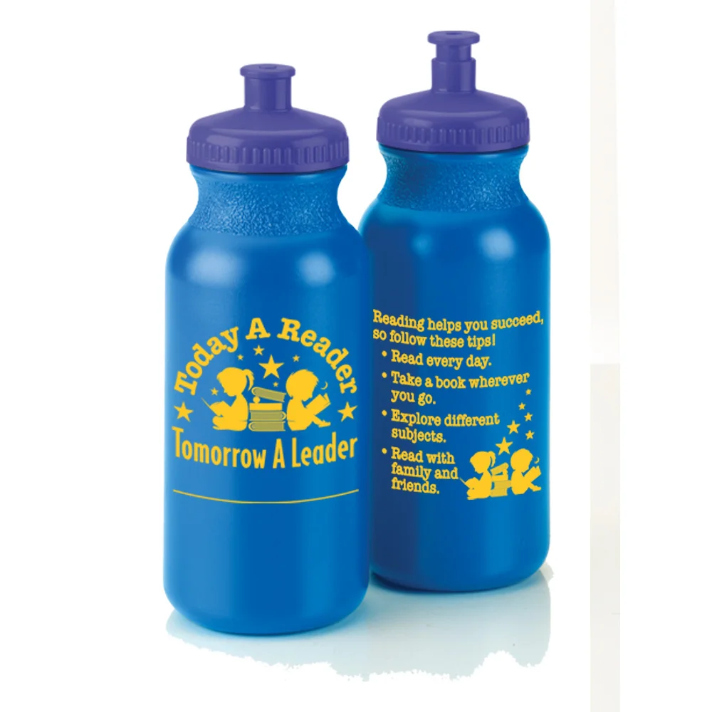 • 20-Oz. Bottle: Sporty, plastic water bottle with screw-on, push-pull lid; Eco friendly; Reusable; BPA free; Holds 20 oz.; Tips on back motivate students to keep good reading habits