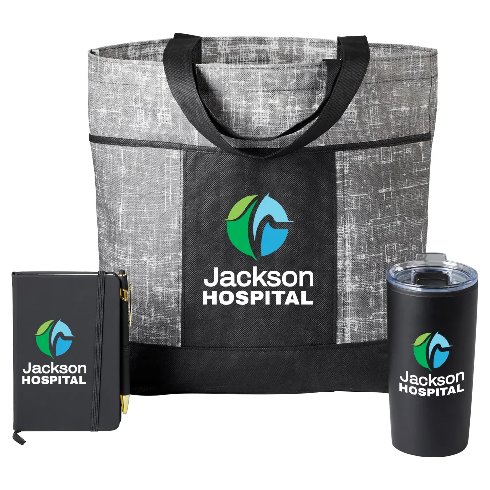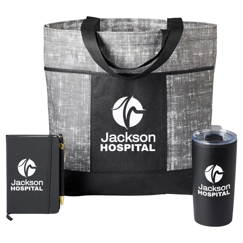 Tote: 14" X 16 3/4" X 5 1/4", Jotter: 4" X 6", Pen: 5 1/2", Ink: Black, Teton: 20-Oz.