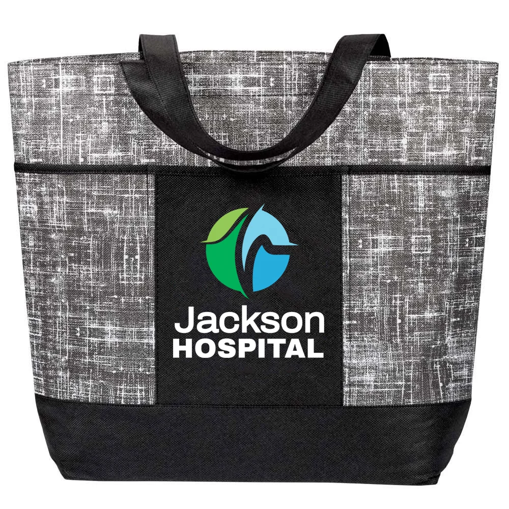 Personalized Tote Bag: Carryall with distressed "denim" look and solid accents; Stylish alternative to single-use bags; Open top with generous 5" bottom gusset; Three front pockets for grab-and-go essentials; Reinforced shoulder straps: Dual 25 1/4" carry handles in solid color coordinate with trendy distressed-look denim pattern; Non-woven polypropylene is eco friendly and recyclable; Reusable