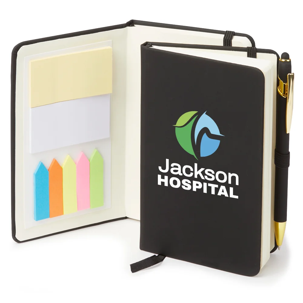 Personalized Jotter, Notes, & Pen Set: Padded, soft-touch, leather-like, hard-cover jotter; 80 lined pages for all your note-taking needs; Inside cover holds two 2.75" x 1.25" sticky pads and five 1.75" x 1.5" neon sticky flag pads (25 each of 5 colors - 125 flags total!); Ribbon page marker keeps your place; Elastic strap closure keeps everything secure; Elastic pen loop holds the included metal stylus pen with smooth, rubberized finish and gold accents; Black ink