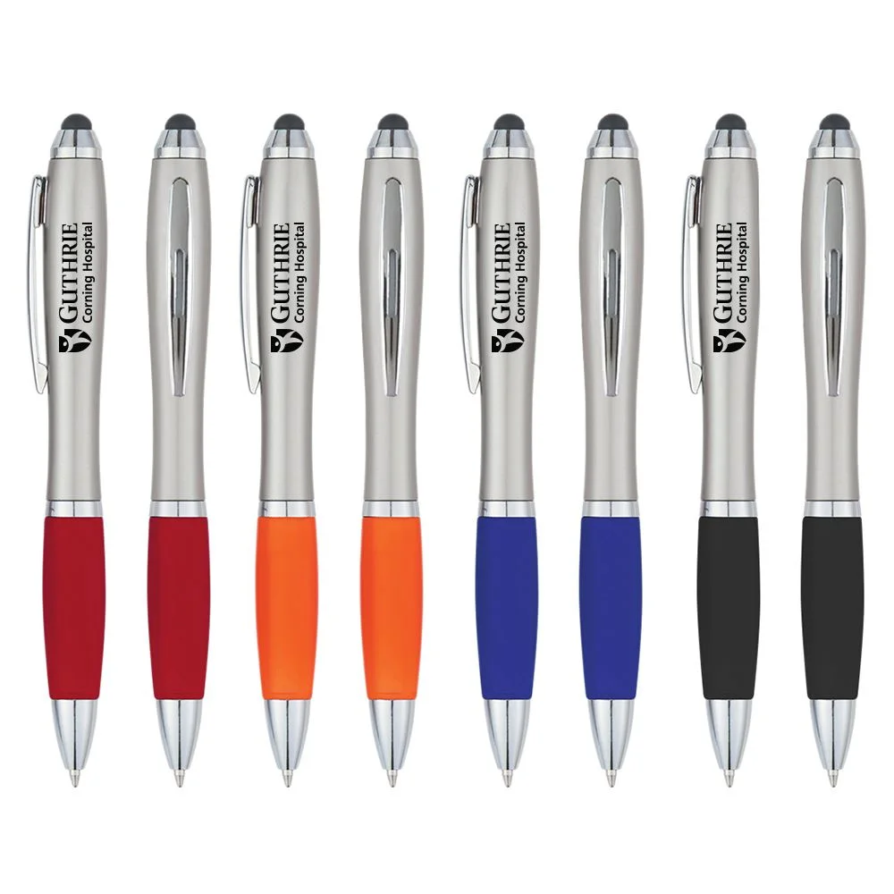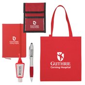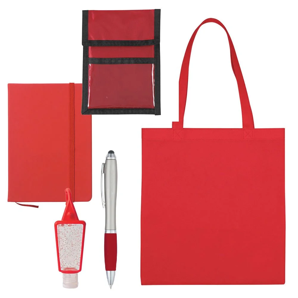 Pen: 5.5"H, Tote Bag: 13.5"W X 14"H, Notebook: 5"W X 7"H, Wallet: 5" W X 6.625"H, Hand Sanitizer: 1.375"W X 3"H