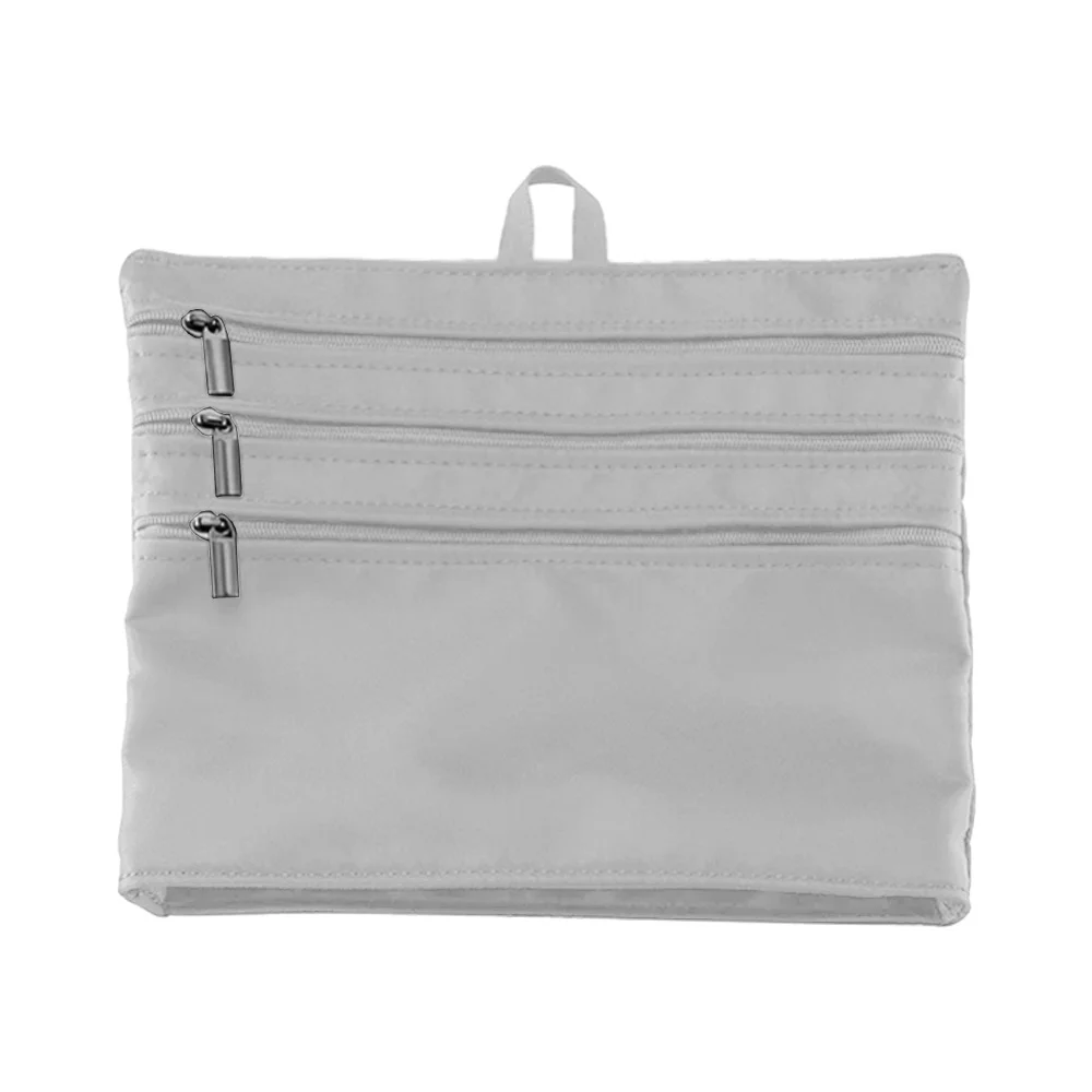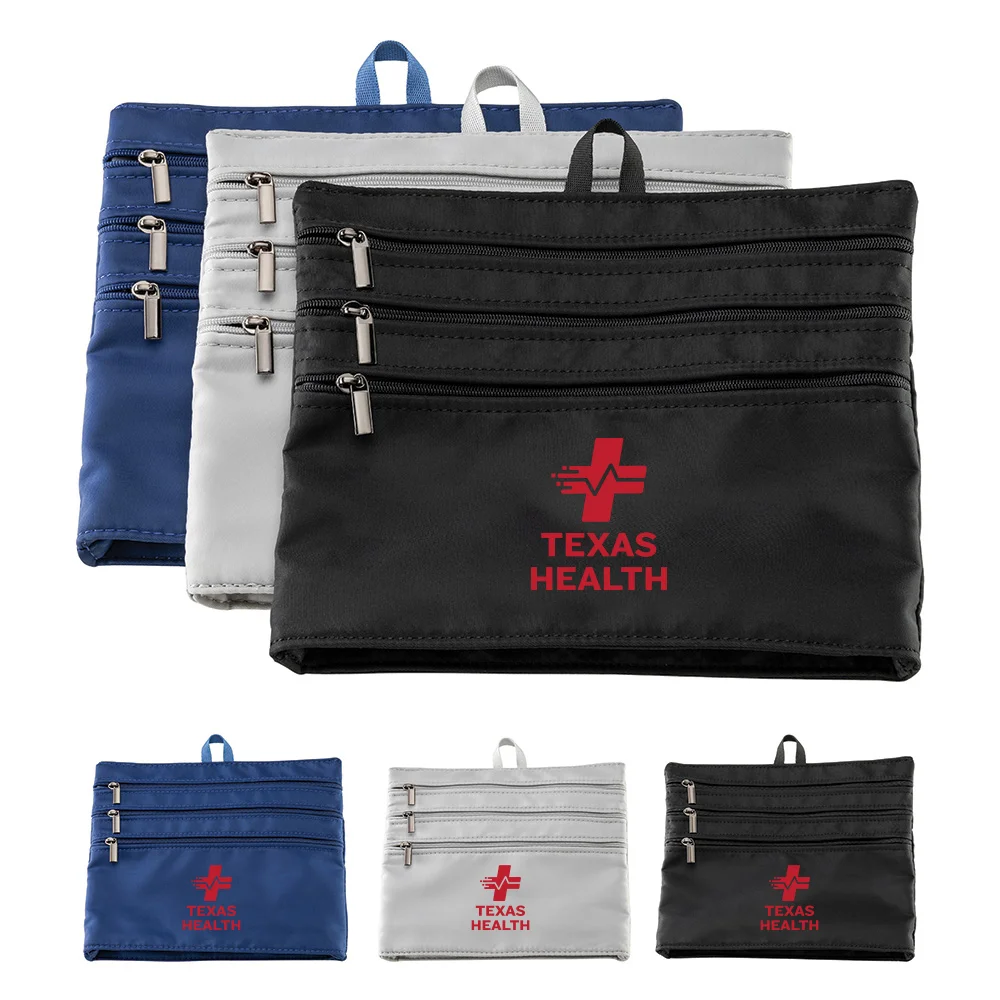 Three zippered pockets on front; One zippered pocket on back